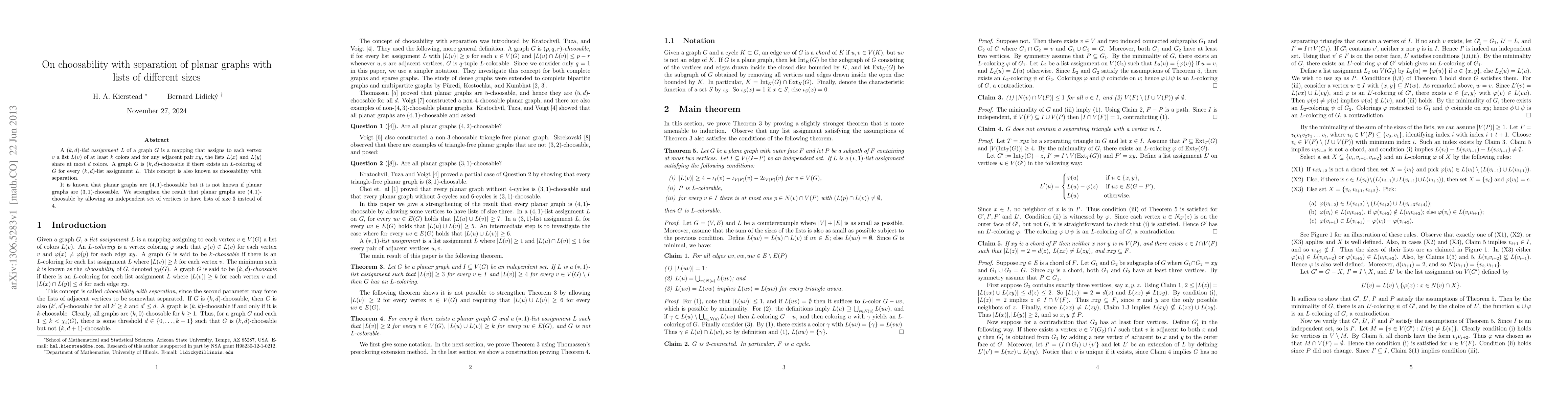 The paper proves key results about the choosability with separation of planar graphs using a (∗,1)-list assignment, extending previous work on (4,1)-choosability.