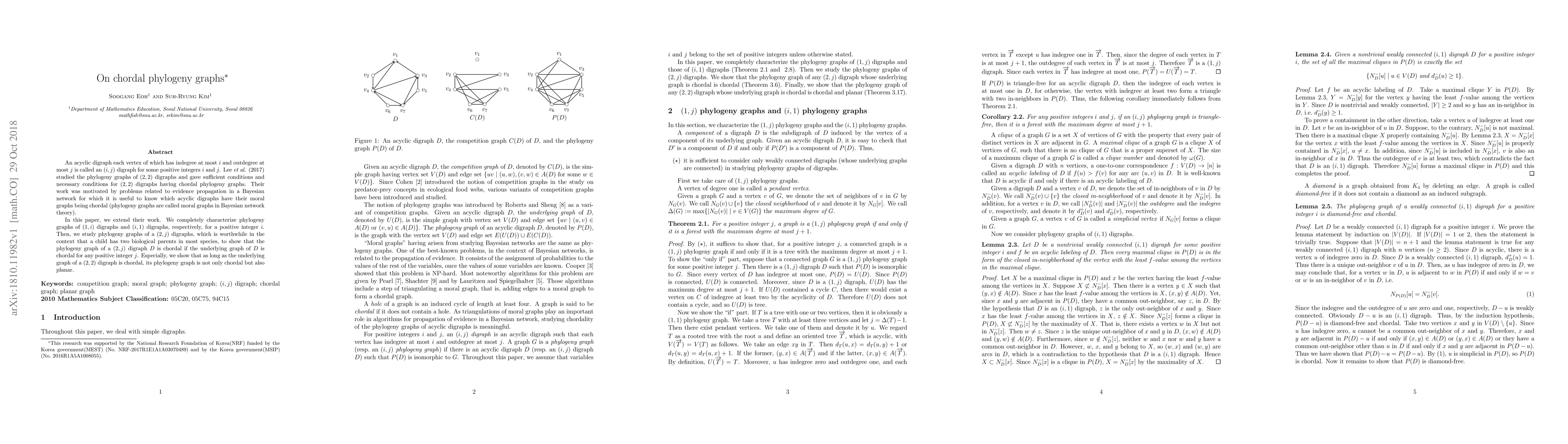 An acyclic digraph each vertex of which has indegree at most $i$ and outdegree at most $j$ is called an $(i, j)$ digraph for some positive integers $i$ and $j$. Lee {\it et al.} (2017) studied the phylogeny graphs of $(2, 2)$ digraphs and gave sufficient conditions and necessary conditions for $(2, 2)$ digraphs having chordal phylogeny graphs. Their work was motivated by problems related to evidence propagation in a Bayesian network for which it is useful to know which acyclic digraphs have their moral graphs being chordal (phylogeny graphs are called moral graphs in Bayesian network theory). In this paper, we extend their work. We completely characterize phylogeny graphs of $(1, i)$ digraphs and $(i,1)$ digraphs, respectively, for a positive integer $i$. Then, we study phylogeny graphs of a $(2,j)$ digraphs, which is worthwhile in the context that a child has two biological parents in most species, to show that the phylogeny graph of a $(2,j)$ digraph $D$ is chordal if the underlying graph of $D$ is chordal for any positive integer $j$. Especially, we show that as long as the underlying graph of a $(2,2)$ digraph is chordal, its phylogeny graph is not only chordal but also planar.