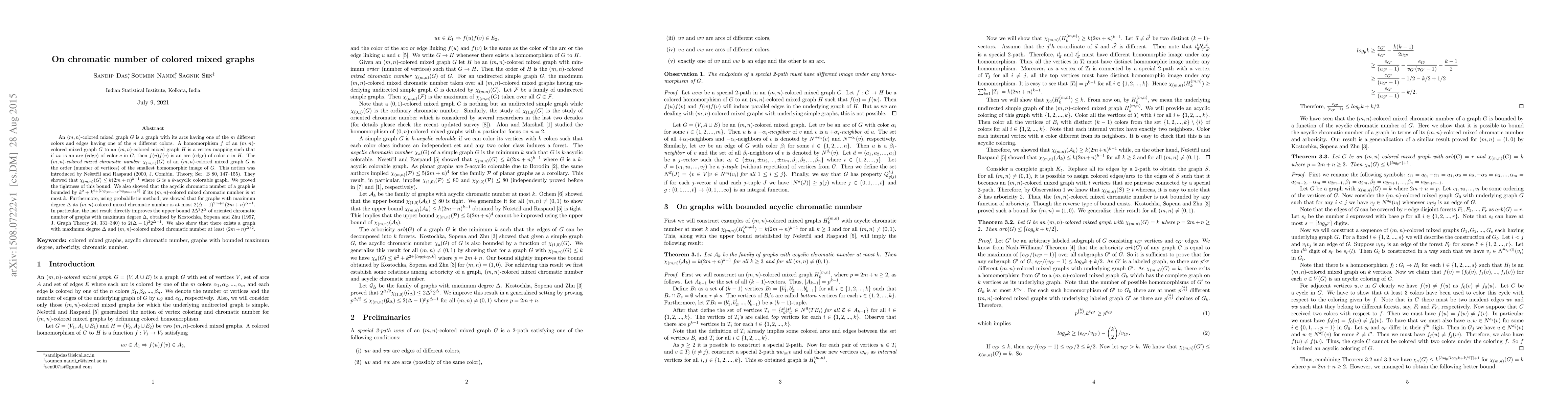 The research extends existing work by providing tighter bounds and demonstrating the relationship between the acyclic chromatic number and the $(m,n)$-colored mixed chromatic number, along with a probabilistic method for bounding chromatic numbers in graphs with maximum degree $\Delta$.