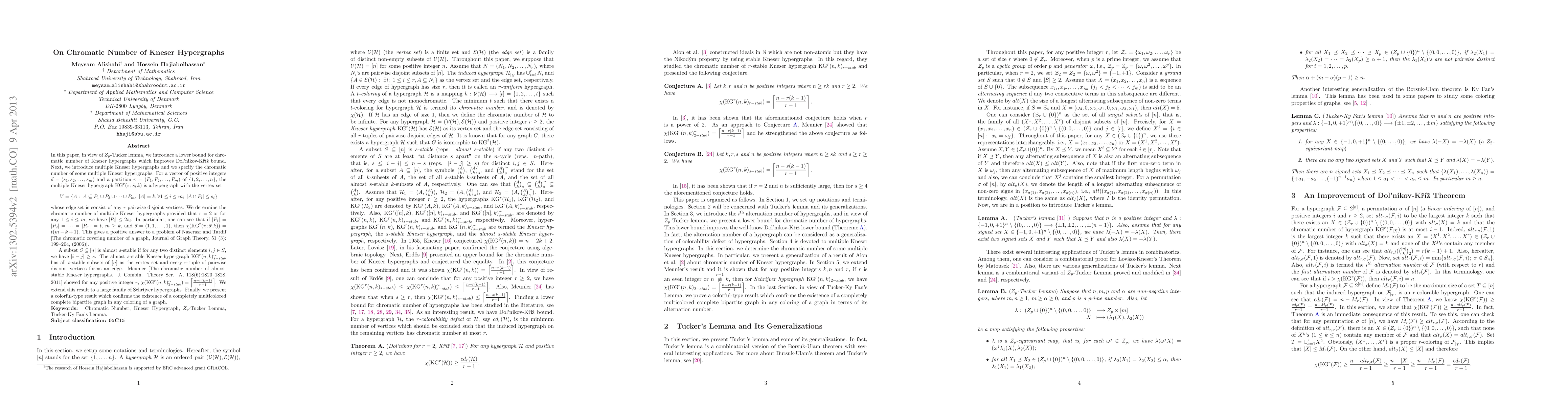In this paper, in view of $Z_p$-Tucker lemma, we introduce a lower bound for chromatic number of Kneser hypergraphs which improves Dol'nikov-K{\v{r}}{\'{\i}}{\v{z}} bound. Next, we introduce multiple Kneser hypergraphs and we specify the chromatic number of some multiple Kneser hypergraphs. For a vector of positive integers $\vec{s}=(s_1,s_2,\ldots,s_m)$ and a partition $\pi=(P_1,P_2,\ldots,P_m)$ of $\{1,2,\ldots,n\}$, the multiple Kneser hypergraph ${\rm KG}^r(\pi; \vec{s};k)$ is a hypergraph with the vertex set $$V=\left\{A:\ A\subseteq P_1\cup P_2\cup\cdots \cup P_m,\ |A|=k, \forall 1\leq i\leq m;\ |A\cap P_i|\leq s_i\right\}$$ whose edge set is consist of any $r$ pairwise disjoint vertices. We determine the chromatic number of multiple Kneser hypergraphs provided that $r=2$ or for any $1\leq i\leq m$, we have $|P_i|\leq 2s_i$. A subset $S \subseteq [n]$ is almost $s$-stable if for any two distinct elements $i,j\in S$, we have $|i-j|\geq s$. The almost $s$-stable Kneser hypergraph ${\rm KG}^r(n,k)_{s-stab}^{\sim}$ has all $s$-stable subsets of $[n]$ as the vertex set and every $r$-tuple of pairwise disjoint vertices forms an edge. Meunier [The chromatic number of almost stable Kneser hypergraphs. J. Combin. Theory Ser. A, 118(6):1820--1828, 2011] showed for any positive integer $r$, $\chi({\rm KG}^r(n,k)_{2-stab}^{\sim})=\left\lceil {n-r(k-1) \over r-1}\right\rceil$. We extend this result to a large family of Schrijver hypergraphs. Finally, we present a colorful-type result which confirms the existence of a completely multicolored complete bipartite graph in any coloring of a graph.