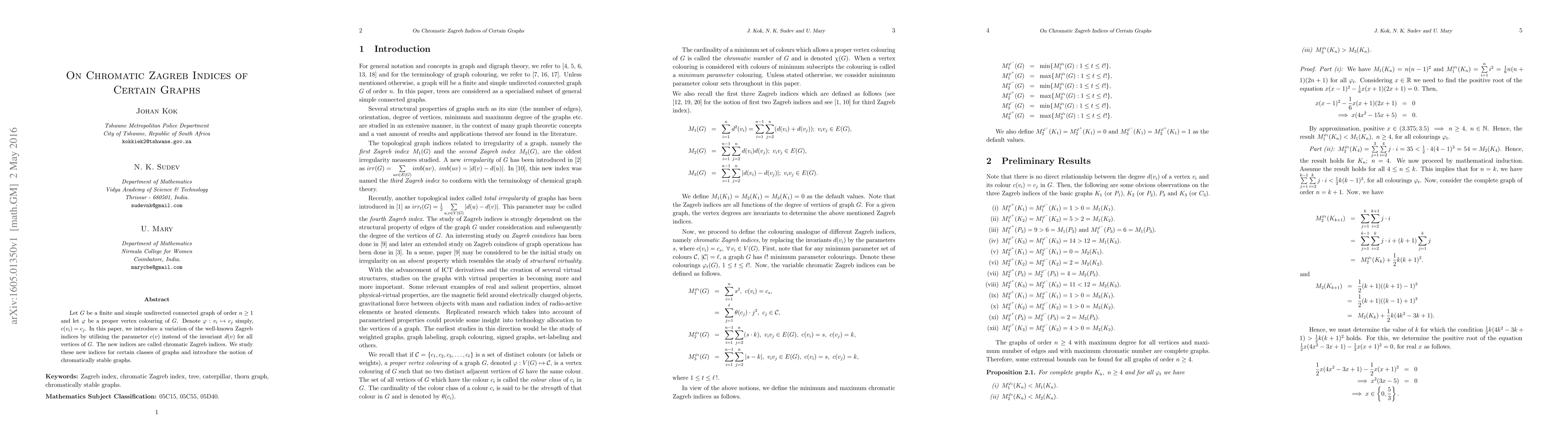 This paper introduces chromatic Zagreb indices, a variation of the Zagreb indices based on vertex coloring instead of degree, and explores the concept of chromatically stable graphs. The study focuses on the relationship between these indices and graph coloring properties.
