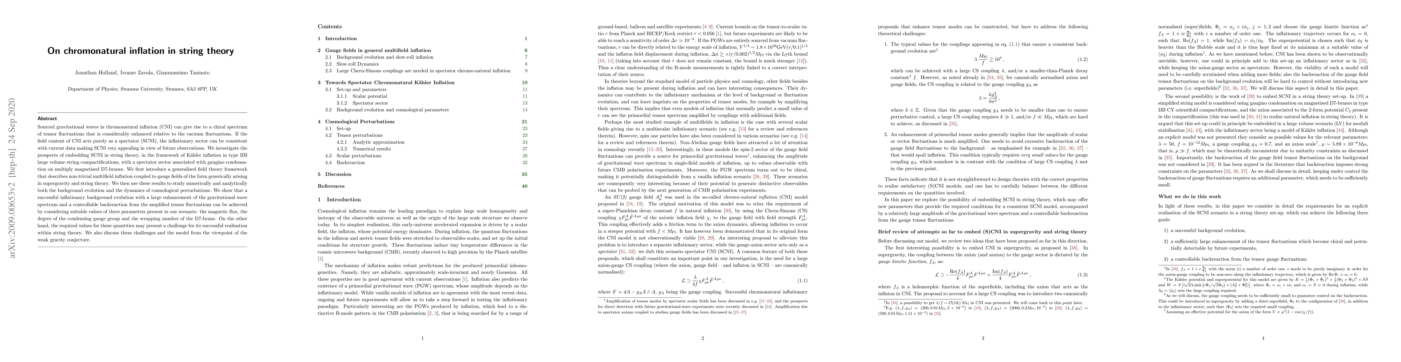 Sourced gravitational waves in chromonatural inflation (CNI) can give rise to a chiral spectrum of tensor fluctuations that is considerably enhanced relative to the vacuum fluctuations. If the field content of CNI acts purely as a spectator (SCNI), the inflationary sector can be consistent with current data making SCNI very appealing in view of future observations. We investigate the prospects of embedding SCNI in string theory, in the framework of K\"ahler inflation in type IIB large volume string compactifications, with a spectator sector associated with gaugino condensation on multiply magnetised D7-branes. We first introduce a generalised field theory framework that describes non-trivial multifield inflation coupled to gauge fields of the form generically arising in supergravity and string theory. We then use these results to study numerically and analytically both the background evolution and the dynamics of cosmological perturbations. We show that a successful inflationary background evolution with a large enhancement of the gravitational wave spectrum and a controllable backreaction from the amplified tensor fluctuations can be achieved by considering suitable values of three parameters present in our scenario: the magnetic flux, the degree of the condensing gauge group and the wrapping number of the D7-brane. On the other hand, the required values for these quantities may present a challenge for its successful realisation within string theory. We also discuss these challenges and the model from the viewpoint of the weak gravity conjecture.