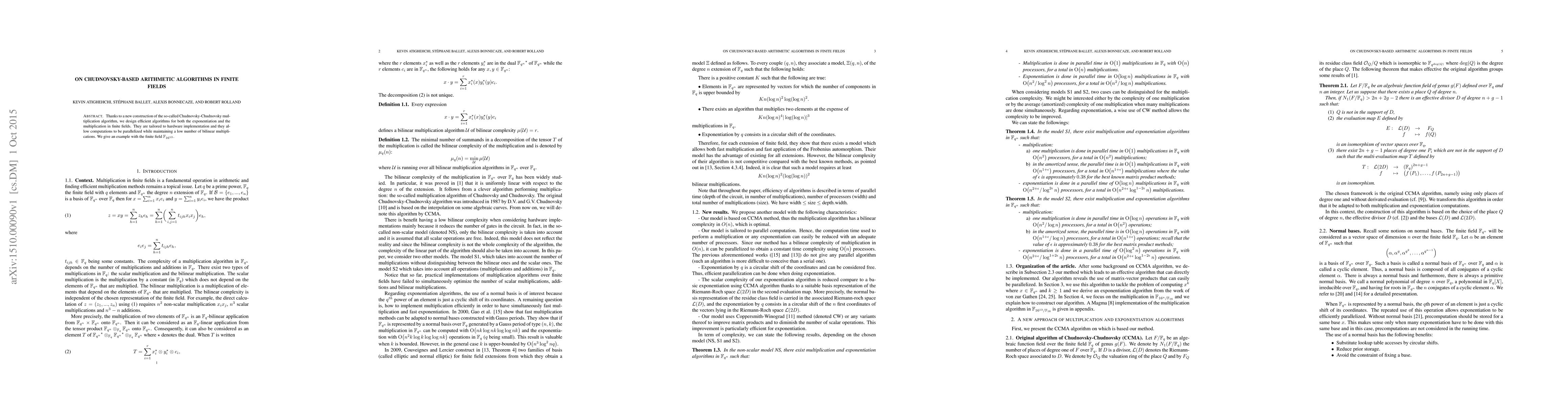 Thanks to a new construction of the so-called Chudnovsky-Chudnovsky multiplication algorithm, we design efficient algorithms for both the exponentiation and the multiplication in finite fields. They are tailored to hardware implementation and they allow computations to be parallelized while maintaining a low number of bilinear multiplications. We give an example with the finite field ${\mathbb F}_{16^{13}}$.