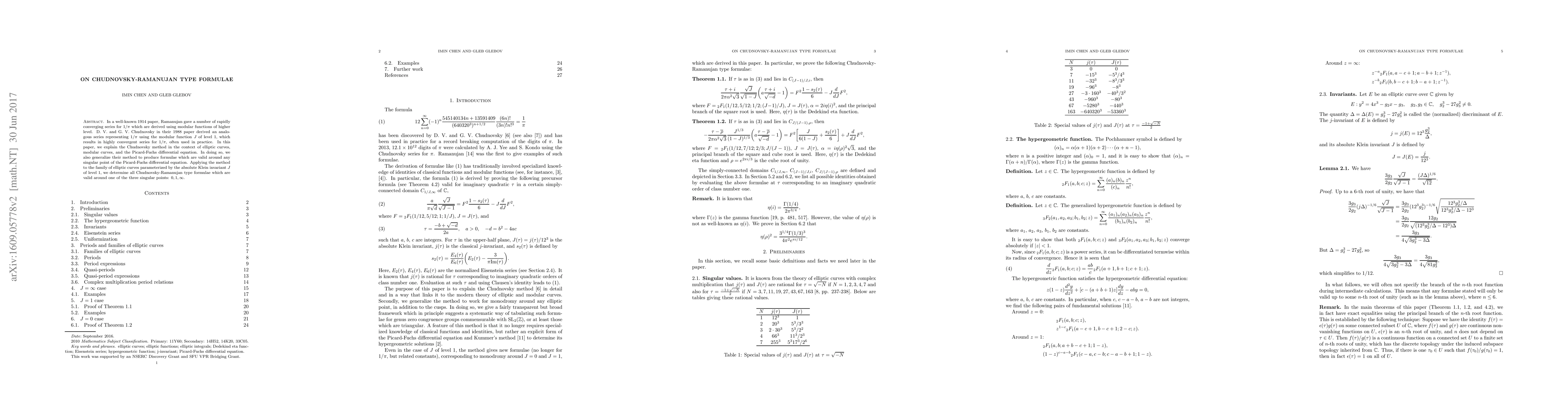 In a well-known 1914 paper, Ramanujan gave a number of rapidly converging series for $1/\pi$ which are derived using modular functions of higher level. D. V. and G. V. Chudnovsky in their 1988 paper derived an analogous series representing $1/\pi$ using the modular function $J$ of level 1, which results in highly convergent series for $1/\pi$, often used in practice. In this paper, we explain the Chudnovsky method in the context of elliptic curves, modular curves, and the Picard-Fuchs differential equation. In doing so, we also generalize their method to produce formulae which are valid around any singular point of the Picard-Fuchs differential equation. Applying the method to the family of elliptic curves parameterized by the absolute Klein invariant $J$ of level 1, we determine all Chudnovsky-Ramanujan type formulae which are valid around one of the three singular points: $0, 1, \infty$.