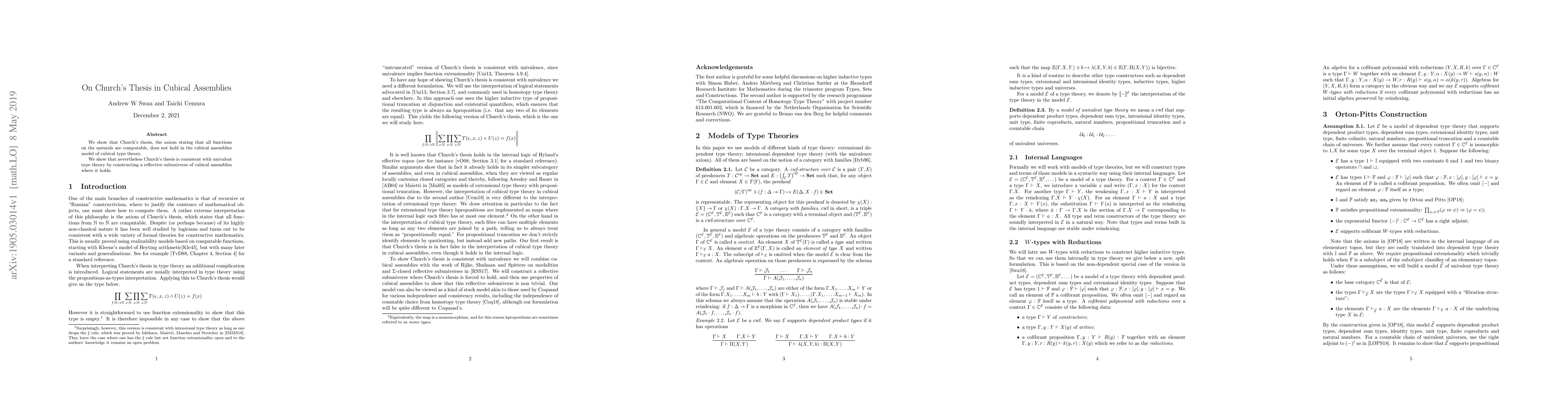 This paper demonstrates that Church's thesis does not apply to the cubical assemblies model of cubical type theory, but it remains consistent with univalent type theory through the construction of a reflective subuniverse where it holds.