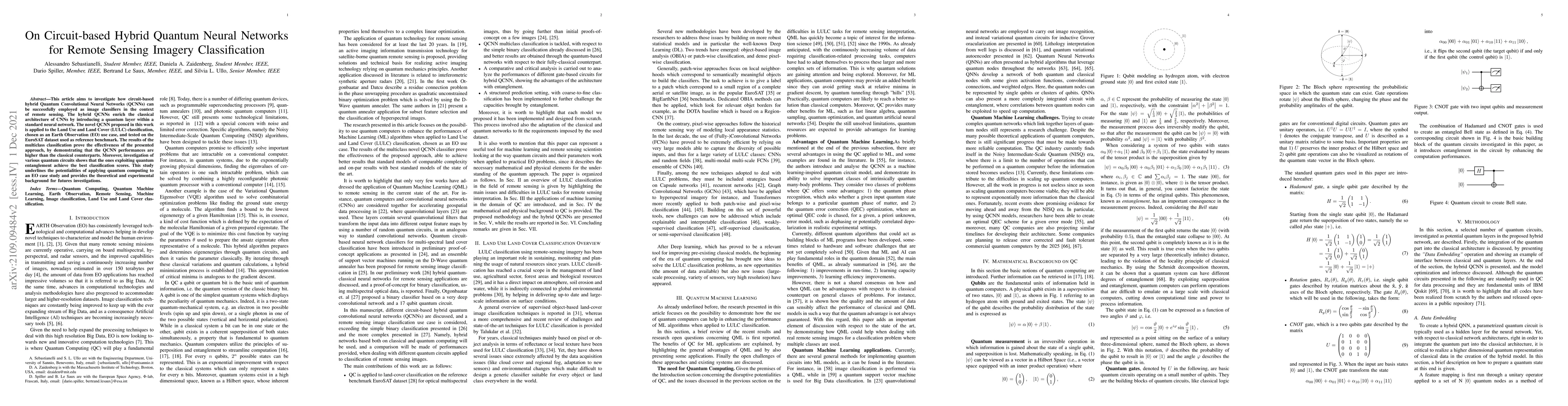 This article aims to investigate how circuit-based hybrid Quantum Convolutional Neural Networks (QCNNs) can be successfully employed as image classifiers in the context of remote sensing. The hybrid QCNNs enrich the classical architecture of CNNs by introducing a quantum layer within a standard neural network. The novel QCNN proposed in this work is applied to the Land Use and Land Cover (LULC) classification, chosen as an Earth Observation (EO) use case, and tested on the EuroSAT dataset used as reference benchmark. The results of the multiclass classification prove the effectiveness of the presented approach, by demonstrating that the QCNN performances are higher than the classical counterparts. Moreover, investigation of various quantum circuits shows that the ones exploiting quantum entanglement achieve the best classification scores. This study underlines the potentialities of applying quantum computing to an EO case study and provides the theoretical and experimental background for futures investigations.