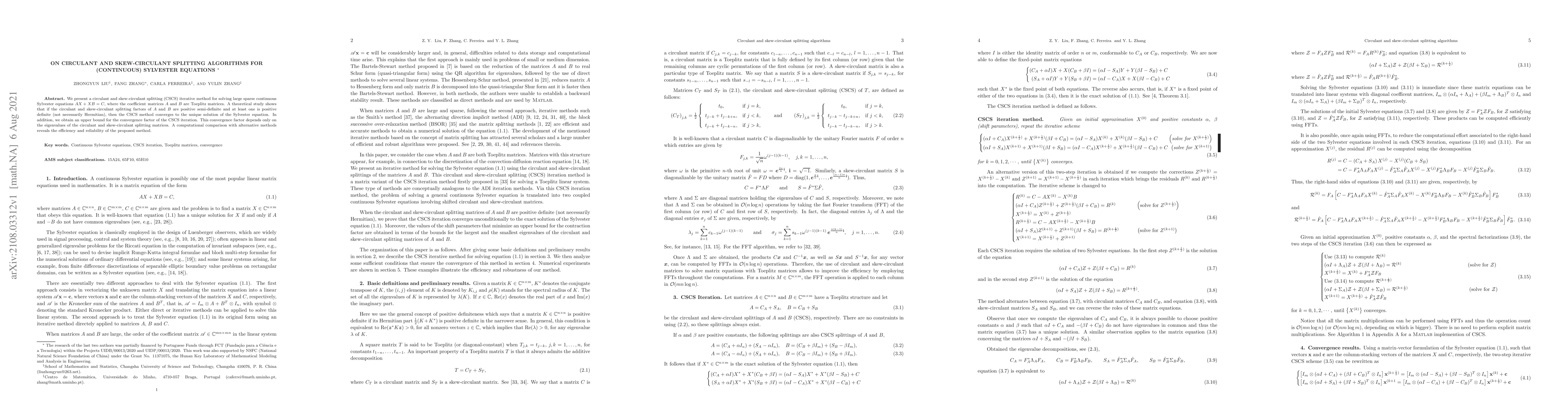 This paper introduces a CSCS iterative method for solving large sparse continuous Sylvester equations, demonstrating convergence under certain conditions on the matrices' splitting factors and providing an upper bound for the convergence factor based on the eigenvalues of these factors. The method is shown to be efficient and reliable compared to alternative approaches.