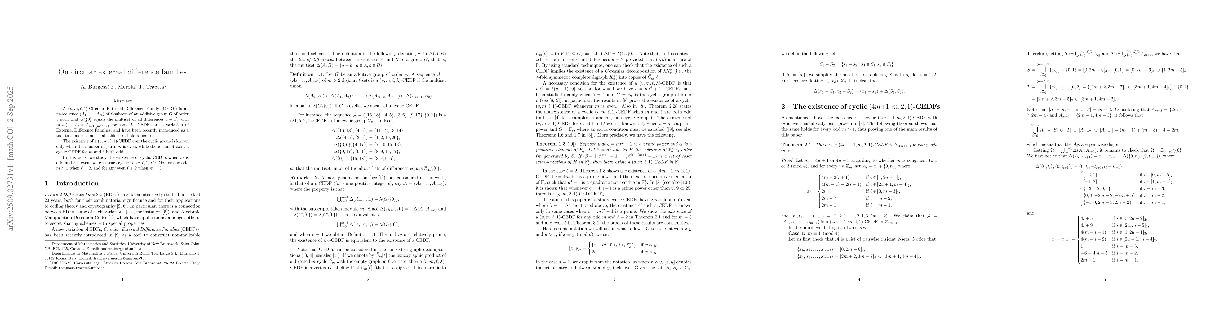 A $(v,m,\ell,1)$-Circular External Difference Family (CEDF) is an $m$-sequence $(A_1, \ldots, A_m)$ of $\ell$-subsets of an additive group $G$ of order $v$ such that $G\setminus\{0\}$ equals the multiset of all differences $a-a'$, with $(a,a')\in A_i\times A_{i+1 \pmod{m}}$ for some $i$. CEDFs are a variation of External Difference Families, and have been recently introduced as a tool to construct non-malleable threshold schemes. The existence of a $(v,m,\ell,1)$-CEDF over the cyclic group is known only when the number of parts $m$ is even, while there cannot exist a cyclic CEDF for $m$ and $\ell$ both odd. In this work, we study the existence of cyclic CEDFs when $m$ is odd and $\ell$ is even: we construct cyclic $(v,m,\ell,1)$-CEDFs for any odd $m>1$ when $\ell=2$, and for any even $\ell \ge 2$ when $m=3$.