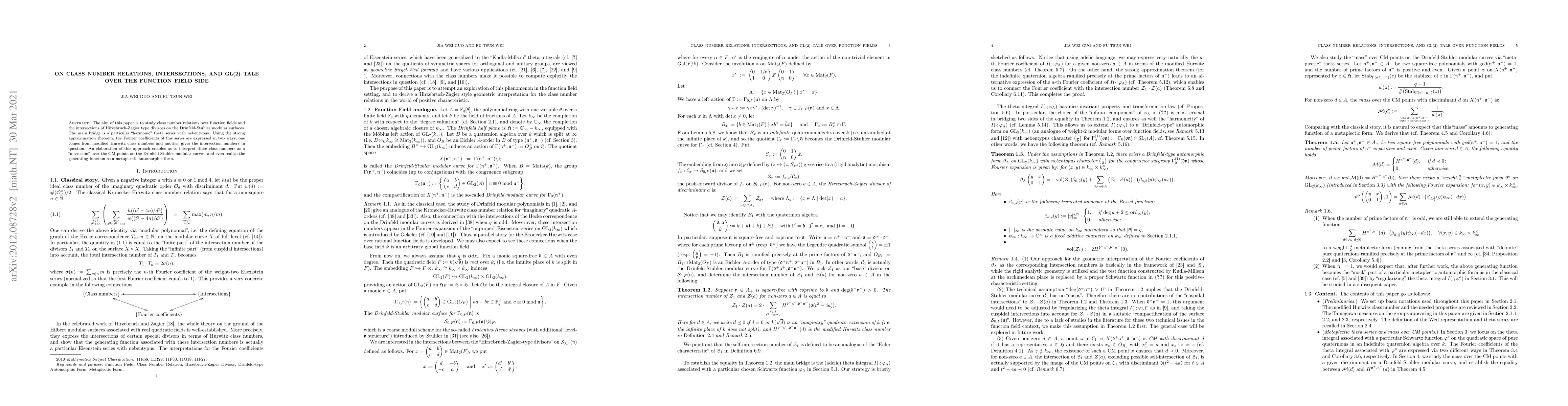The aim of this paper is to study class number relations over function fields and the intersections of Hirzebruch-Zagier type divisors on the Drinfeld-Stuhler modular surfaces. The main bridge is a particular "harmonic" theta series with nebentypus. Using the strong approximation theorem, the Fourier coefficients of this series are expressed in two ways; one comes from modified Hurwitz class numbers and another gives the intersection numbers in question. An elaboration of this approach enables us to interpret these class numbers as a "mass sum" over the CM points on the Drinfeld-Stuhler modular curves, and even realize the generating function as a metaplectic automorphic form.