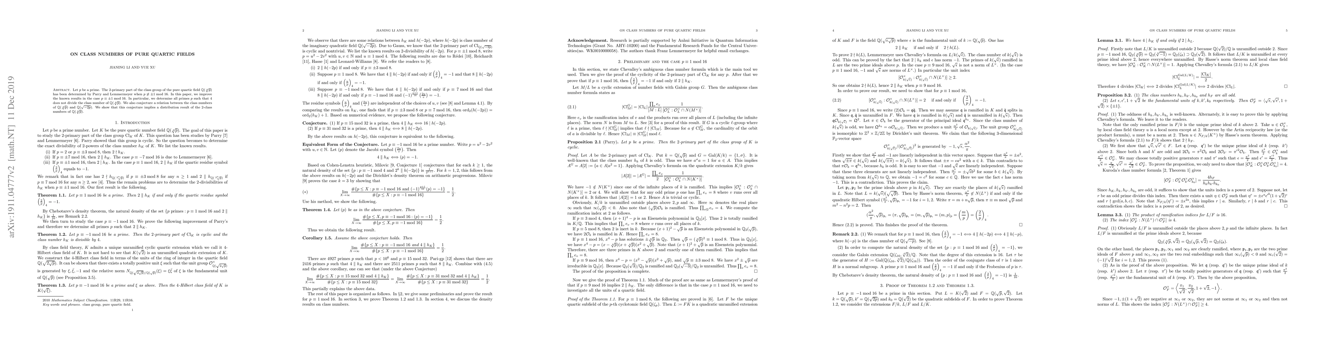 This paper improves the understanding of the 2-primary part of the class group for pure quartic fields $\mathbb{Q}(\sqrt[4]{p})$, specifically for primes $p \equiv \pm 1\bmod 16$. It determines primes $p$ where 4 does not divide the class number and proposes a conjecture linking the class numbers of $\mathbb{Q}(\sqrt[4]{p})$ and $\mathbb{Q}(\sqrt{-2p})$, suggesting a distribution result for 2-class numbers.