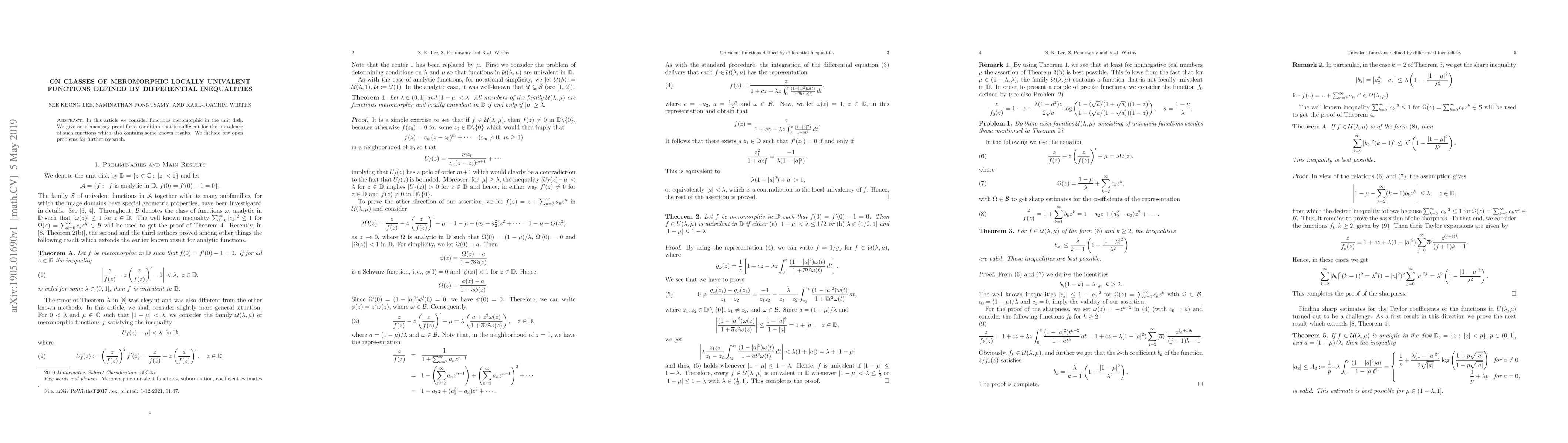 This paper presents an elementary proof for a condition ensuring the univalence of meromorphic functions in the unit disk, encompassing existing results, and proposes several open problems for future research.