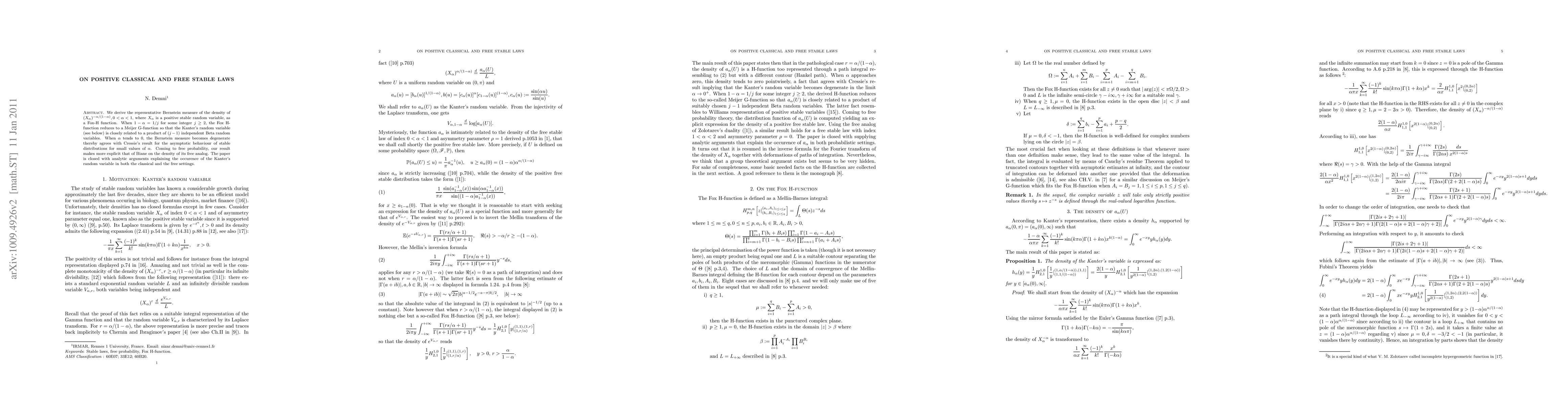 We derive the representative Bernstein measure of the density of $(X_{\alpha})^{-\alpha/(1-\alpha)}, 0 < \alpha < 1$, where $X_{\alpha}$ is a positive stable random variable, as a Fox-H function. When $1-\alpha = 1/j$ for some integer $j \geq 2$, the Fox H-function reduces to a Meijer G-function so that the Kanter's random variable (see below) is closely related to a product of $(j-1)$ independent Beta random variables. When $\alpha$ tends to 0, the Bernstein measure becomes degenerate thereby agrees with Cressie's result for the asymptotic behaviour of stable distributions for small values of $\alpha$. Coming to free probability, our result makes more explicit that of Biane on the density of its free analog. The paper is closed with analytic arguments explaining the occurence of the Kanter's random variable in both the classical and the free settings.