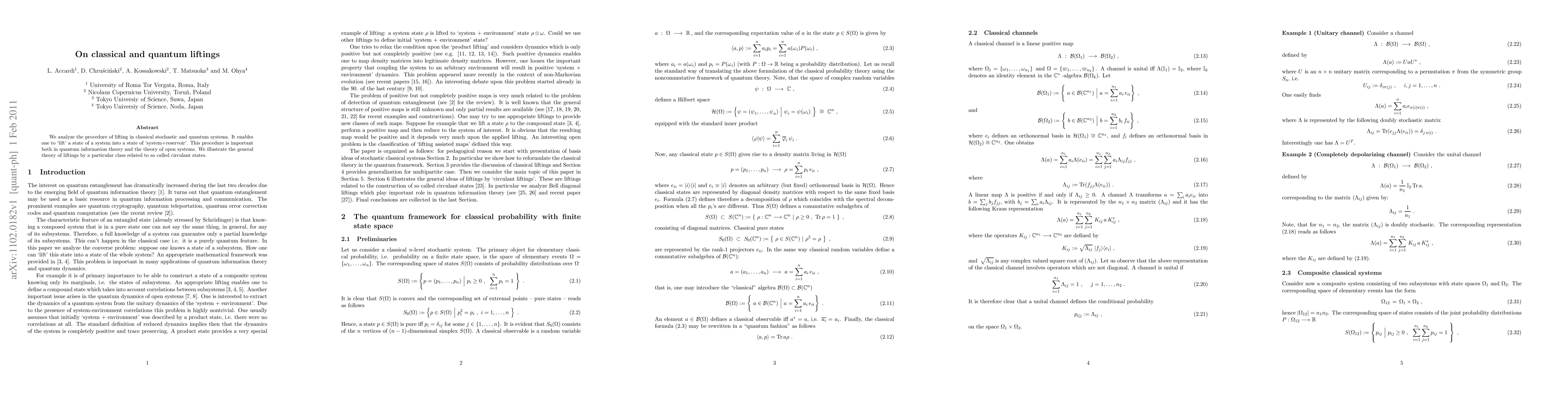 We analyze the procedure of lifting in classical stochastic and quantum systems. It enables one to `lift' a state of a system into a state of `system+reservoir'. This procedure is important both in quantum information theory and the theory of open systems. We illustrate the general theory of liftings by a particular class related to so called circulant states.