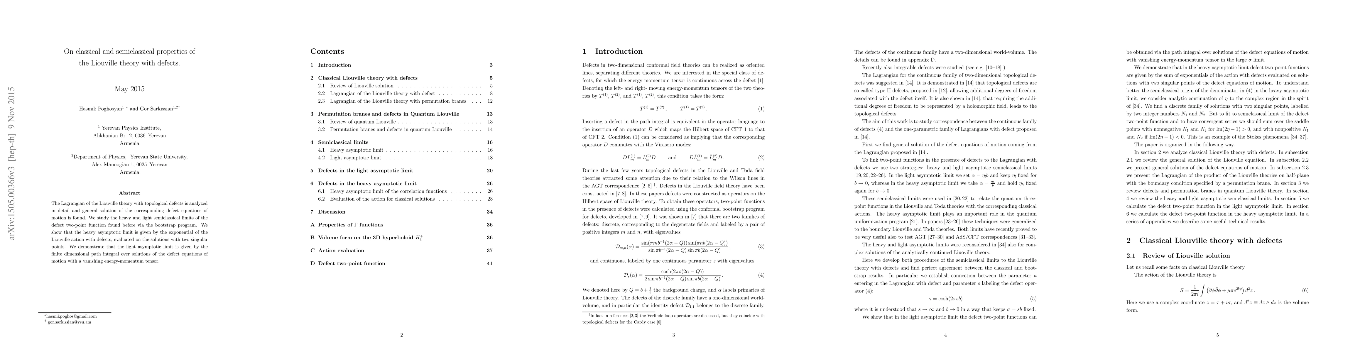 Summary: This research analyzes the Lagrangian of Liouville theory with topological defects, finding a general solution for defect equations of motion. It examines semiclassical limits of the defect two-point function, showing that the heavy limit corresponds to an exponential of the Liouville action with defects, while the light limit involves a finite-dimensional path integral over low-energy solutions.