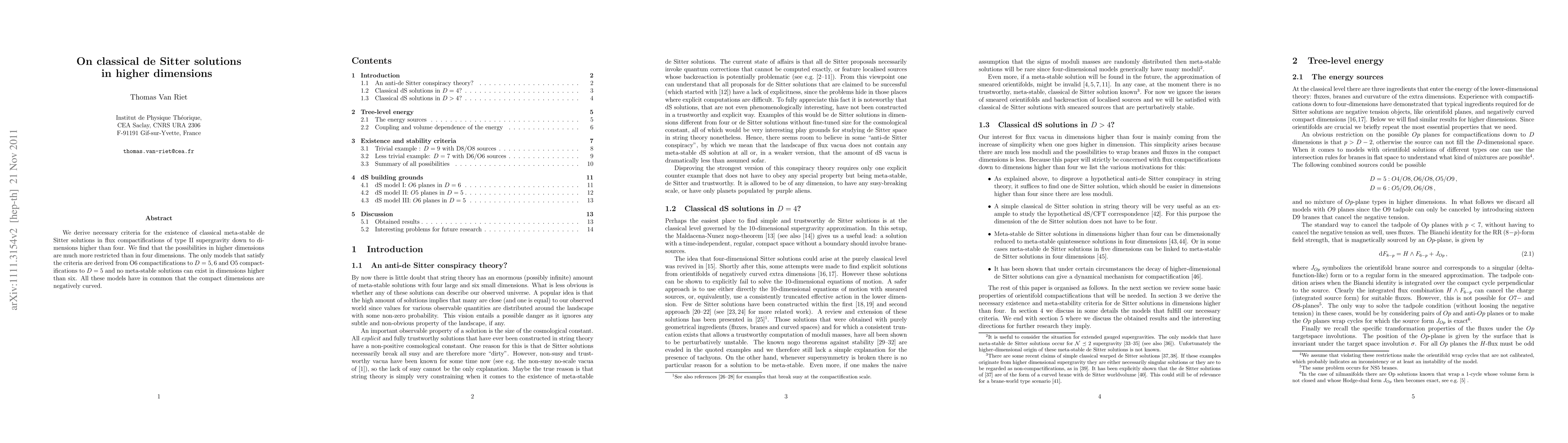 This paper derives criteria for classical, meta-stable de Sitter solutions in higher-dimensional type II supergravity, finding that only specific O6 and O5 compactifications in dimensions five and six allow such solutions, with all compact dimensions being negatively curved. No meta-stable solutions exist in dimensions higher than six.