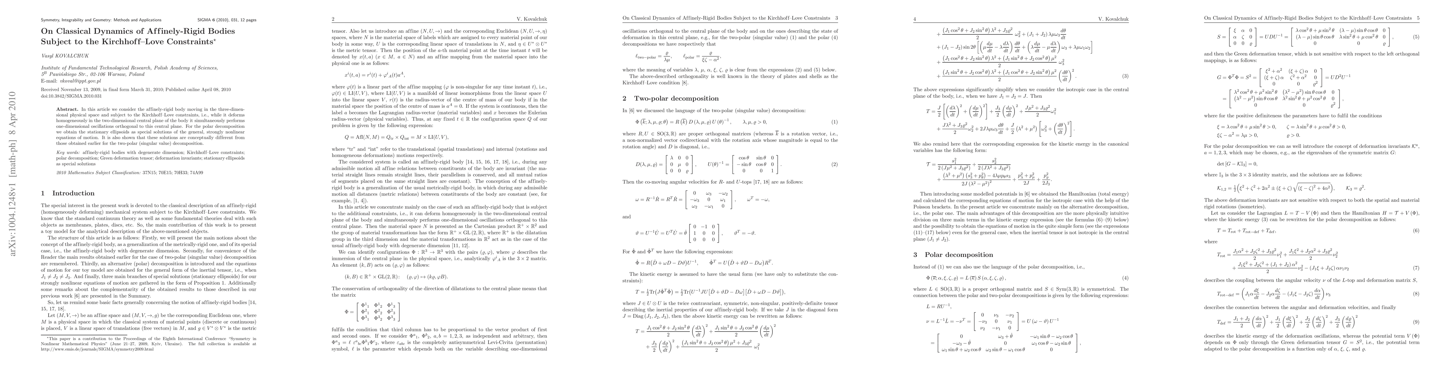 In this article we consider the affinely-rigid body moving in the three-dimensional physical space and subject to the Kirchhoff-Love constraints, i.e., while it deforms homogeneously in the two-dimensional central plane of the body it simultaneously performs one-dimensional oscillations orthogonal to this central plane. For the polar decomposition we obtain the stationary ellipsoids as special solutions of the general, strongly nonlinear equations of motion. It is also shown that these solutions are conceptually different from those obtained earlier for the two-polar (singular value) decomposition.