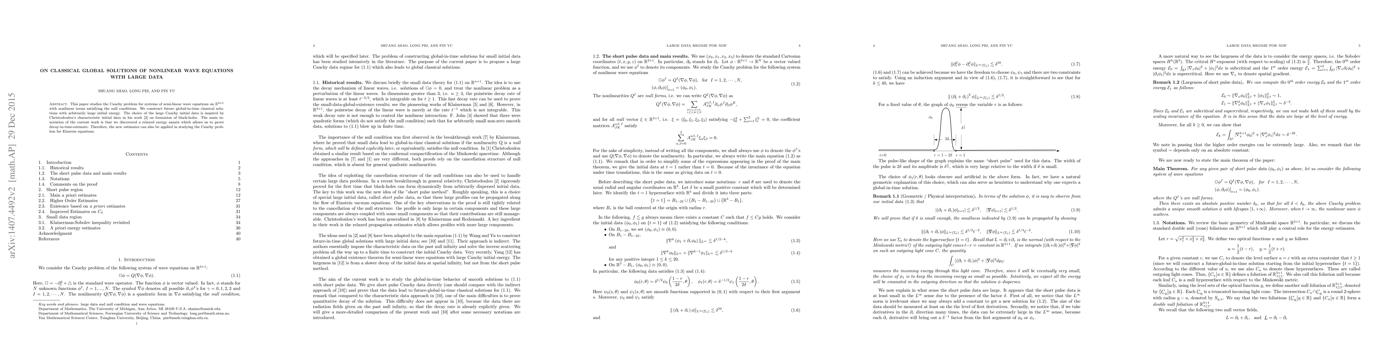 This paper constructs future global-in-time classical solutions for semi-linear wave equations with large initial data, inspired by Christodoulou's black-hole formation work. The key innovation is a relaxed energy ansatz that proves decay-in-time estimates, applicable also to the Cauchy problem for Einstein equations.