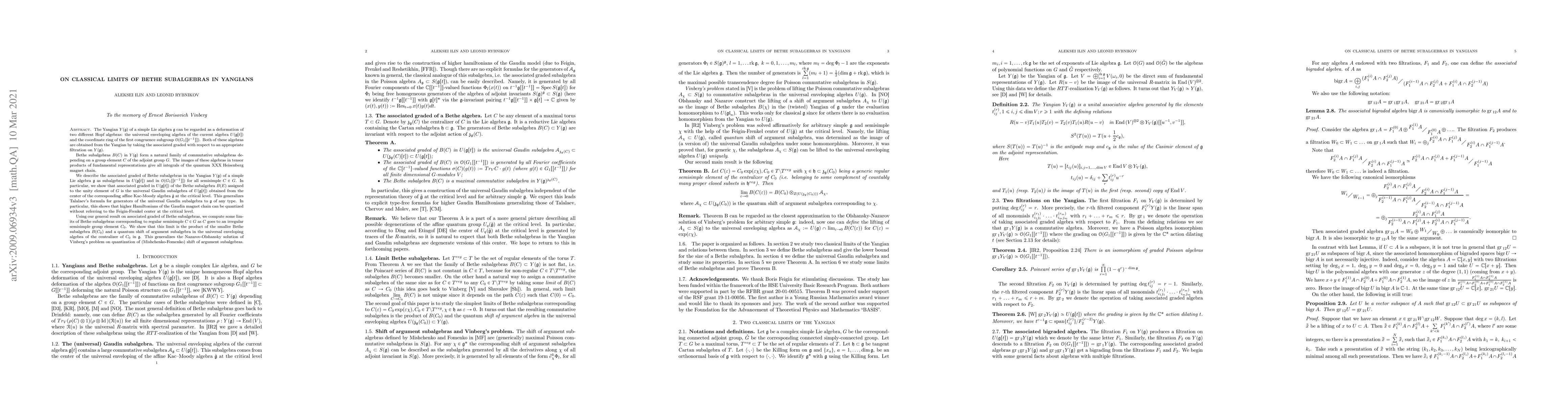The Yangian $Y(\mathfrak{g})$ of a simple Lie algebra $\mathfrak{g}$ can be regarded as a deformation of two different Hopf algebras: the universal enveloping algebra $U(\mathfrak{g}[t])$ and the coordinate ring of the first congruence subgroup $\mathcal{O}(G_1[[t^{-1}]])$. Both of these algebras are obtained from the Yangian by taking the associated graded with respect to an appropriate filtration on Yangian. Bethe subalgebras form a natural family of commutative subalgebras depending on a group element $C$ of the adjoint group $G$. The images of these algebras in tensor products of fundamental representations give all integrals of the quantum XXX Heisenberg magnet chain. We describe the associated graded of Bethe subalgebras as subalgebras in $U(\mathfrak{g}[t])$ and in $\mathcal{O}(G_1[[t^{-1}]])$ for all semisimple $C\in G$. We show that associated graded in $U(\mathfrak{g}[t])$ of the Bethe subalgebra assigned to the identity of $G$ is the universal Gaudin subalgebra of $U(\mathfrak{g}[t])$ obtained from the center of the corresponding affine Kac-Moody algebra at the critical level. This generalizes Talalaev's formula for generators of the universal Gaudin subalgebra to $\mathfrak{g}$ of any type. In particular, this shows that higher Hamiltonians of the Gaudin magnet chain can be quantized without referring to the Feigin-Frenkel center at the critical level. Using our general result on associated graded of Bethe subalgebras, we compute some limits of Bethe subalgebras corresponding to regular semisimple $C\in G$ as $C$ goes to an irregular semisimple group element $C_0$. We show that this limit is the product of the smaller Bethe subalgebra and a quantum shift of argument subalgebra in the universal enveloping algebra of the centralizer of $C_0$ in $\mathfrak{g}$. This generalizes the Nazarov-Olshansky solution of Vinberg's problem on quantization of shift of argument subalgebras.