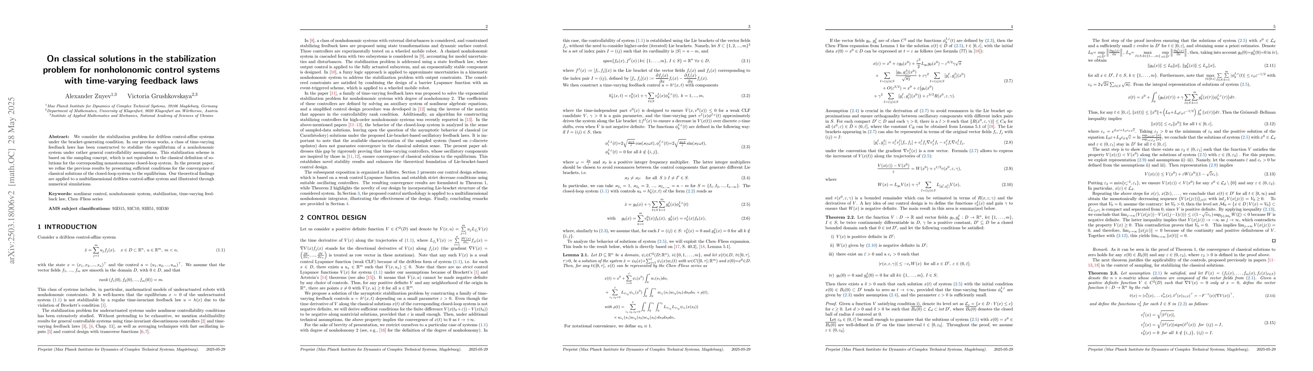 The paper provides sufficient conditions for the convergence of classical solutions in nonholonomic control systems using time-varying feedback laws, bridging the gap between sampling-based approaches and classical solution theory.