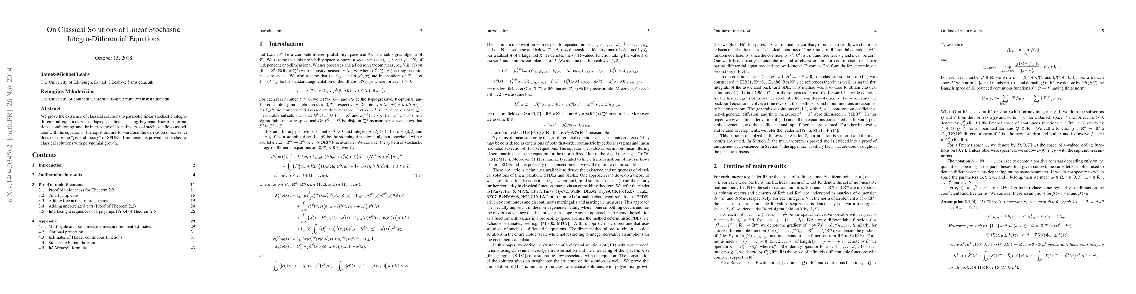 The paper proves the existence of classical solutions for parabolic linear stochastic integro-differential equations using Feynman-Kac transformations and interlacing methods, without relying on general SPDE theory. Uniqueness is established for solutions with polynomial growth.