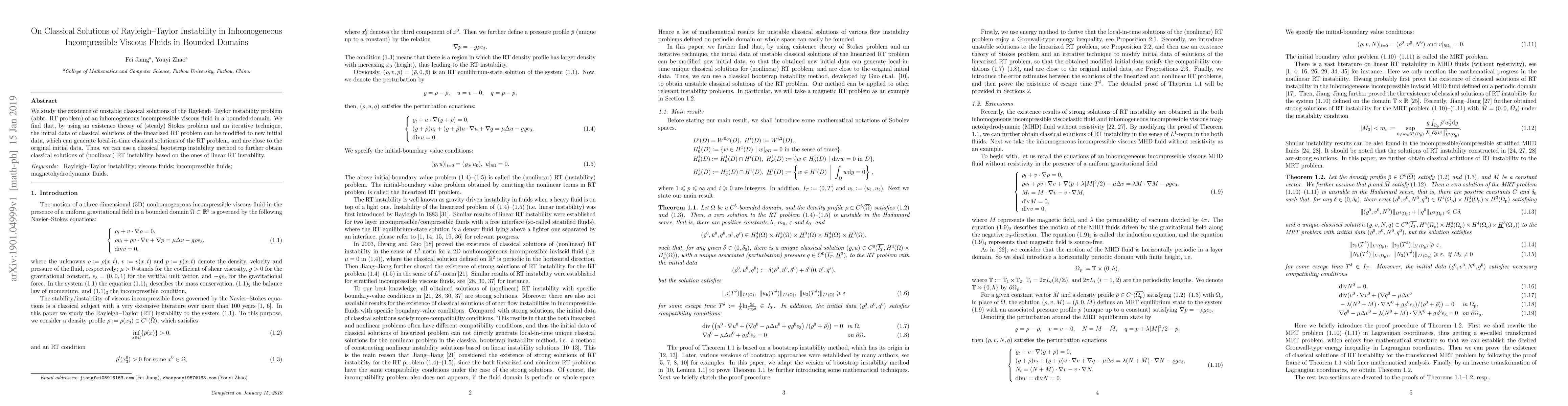 We study the existence of unstable classical solutions of the Rayleigh--Taylor instability problem (abbr. RT problem) of an inhomogeneous incompressible viscous fluid in a bounded domain. We find that, by using an existence theory of (steady) Stokes problem and an iterative technique, the initial data of classical solutions of the linearized RT problem can be modified to new initial data, which can generate local-in-time classical solutions of the RT problem, and are close to the original initial data. Thus, we can use a classical bootstrap instability method to further obtain classical solutions of (nonlinear) RT instability based on the ones of linear RT instability.