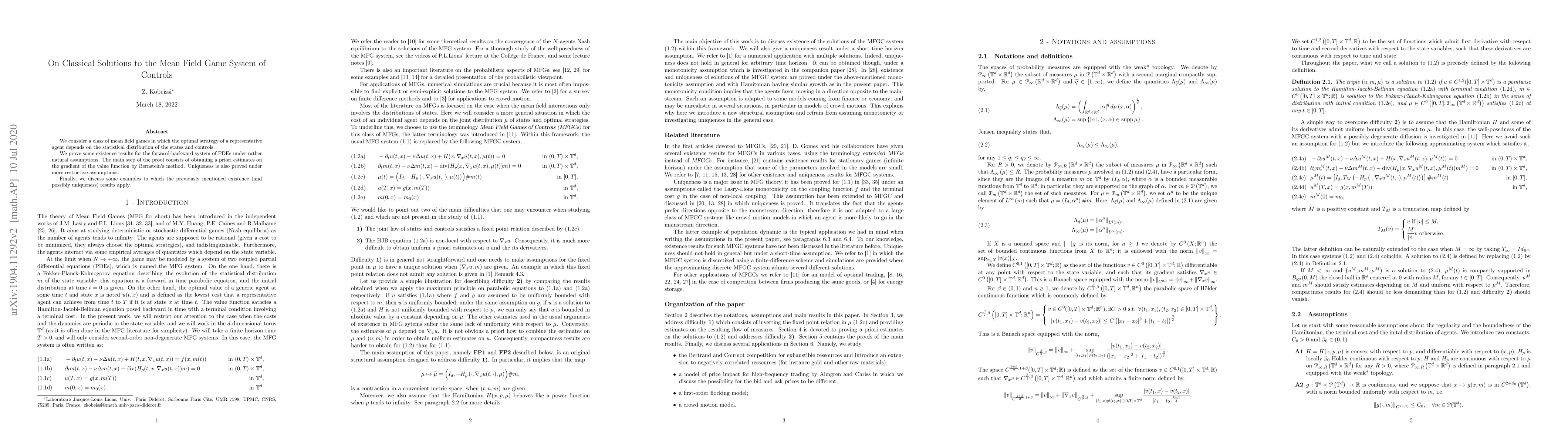 This paper explores classical solutions for mean field game systems, proving existence for the associated forward-backward PDE system under natural assumptions. The proof leverages Bernstein's method for gradient estimates and includes examples demonstrating the applicability of the results.