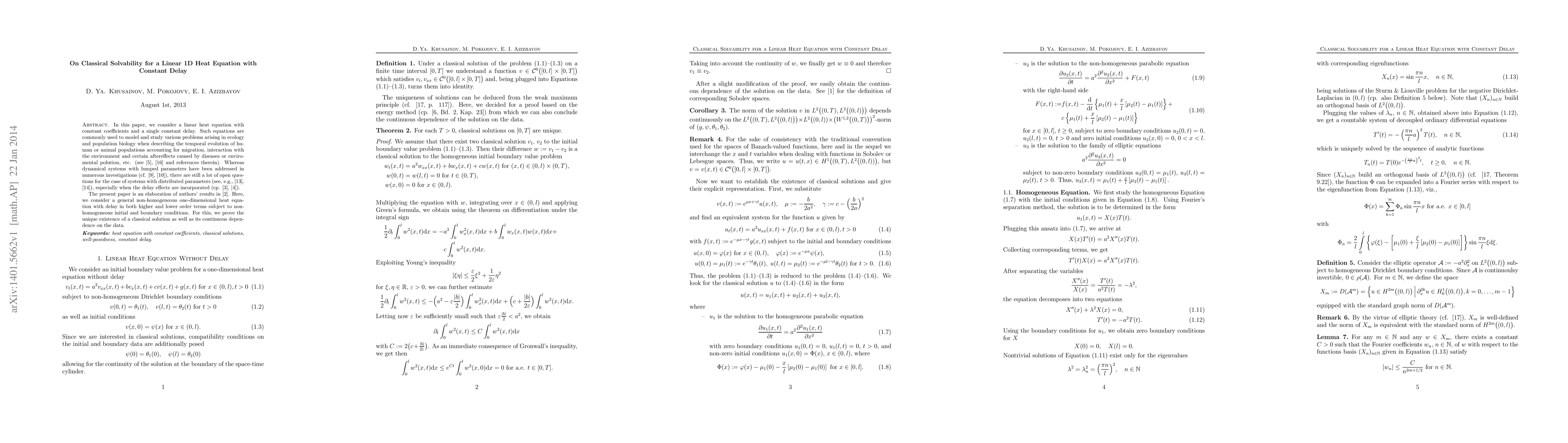 In this paper, we consider a linear heat equation with constant coefficients and a single constant delay. Such equations are commonly used to model and study various problems arising in ecology and population biology when describing the temporal evolution of human or animal populations accounting for migration, interaction with the environment and certain aftereffects caused by diseases or enviromental polution, etc. Whereas dynamical systems with lumped parameters have been addressed in numerous investigations, there still remain a lot of open questions for the case of systems with distributed parameters, especially when the delay effects are incorporated. Here, we consider a general non-homogeneous one-dimensional heat equation with delay in both higher and lower order terms subject to non-homogeneous initial and boundary conditions. For this, we prove the unique existence of a classical solution as well as its continuous dependence on the data.