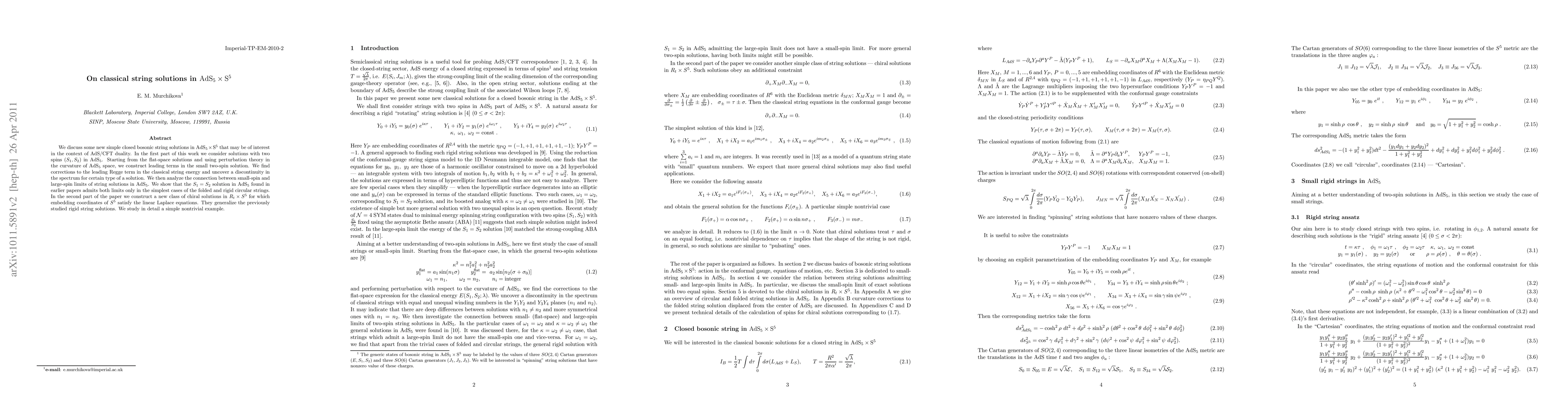 This paper presents new simple closed bosonic string solutions in AdS_5 x S^5, focusing on solutions with two spins in AdS_5. It finds corrections to the string energy and identifies a discontinuity in the spectrum, while also discussing the connection between small-spin and large-spin limits. It also introduces a new class of chiral solutions in R_t x S^5 generalizing previous rigid string solutions, with a detailed study of a nontrivial example.