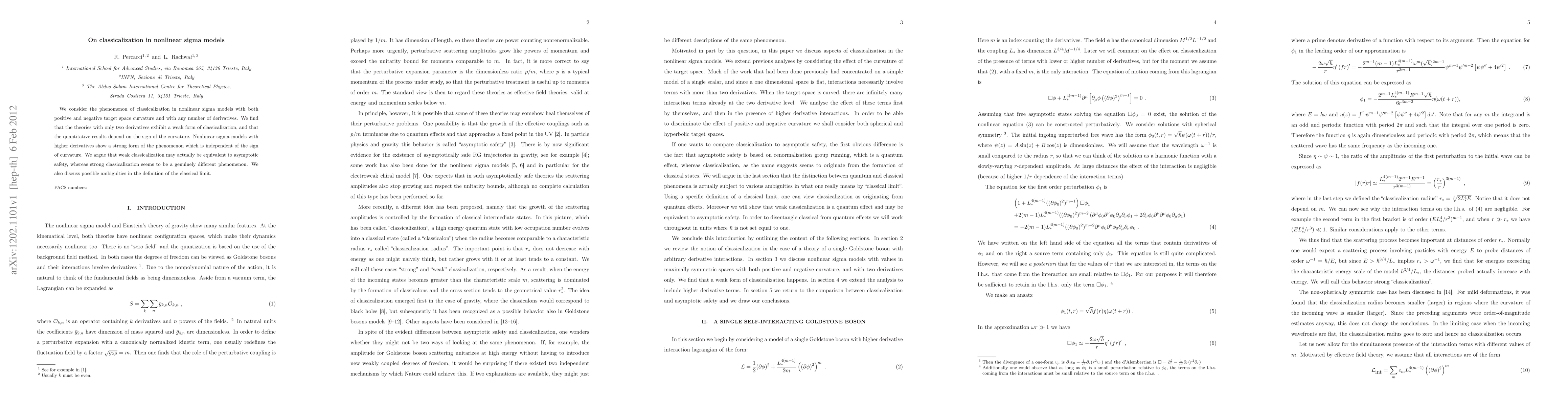 We consider the phenomenon of classicalization in nonlinear sigma models with both positive and negative target space curvature and with any number of derivatives. We find that the theories with only two derivatives exhibit a weak form of classicalization, and that the quantitative results depend on the sign of the curvature. Nonlinear sigma models with higher derivatives show a strong form of the phenomenon which is independent of the sign of curvature. We argue that weak classicalization may actually be equivalent to asymptotic safety, whereas strong classicalization seems to be a genuinely different phenomenon. We also discuss possible ambiguities in the definition of the classical limit.