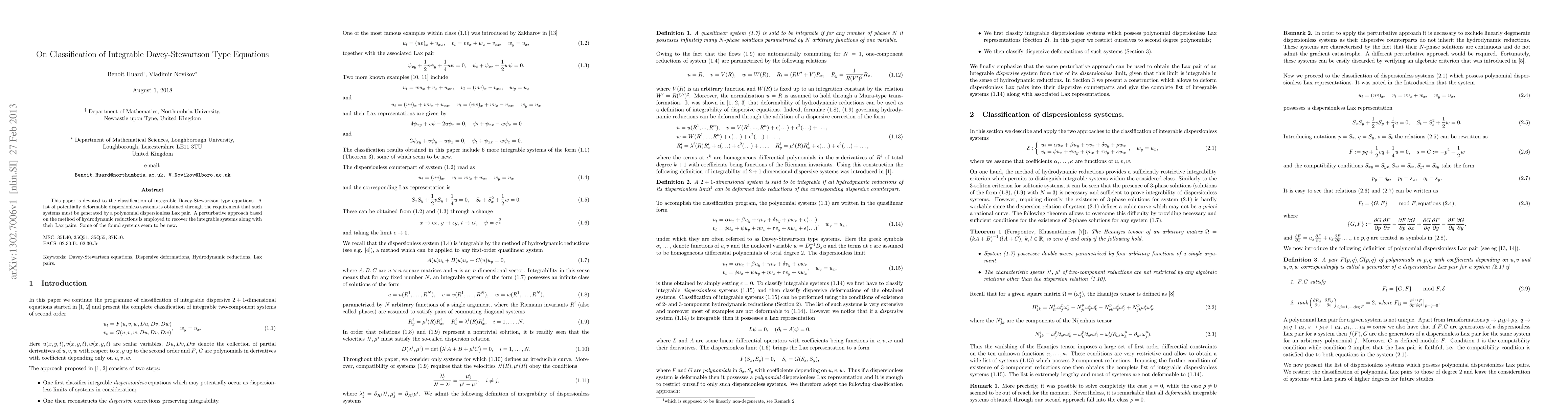 This paper classifies integrable Davey-Stewartson type equations by identifying deformable dispersionless systems generated by polynomial dispersionless Lax pairs, employing a perturbative method based on hydrodynamic reductions to recover these systems and their Lax pairs, revealing some potentially new integrable systems.