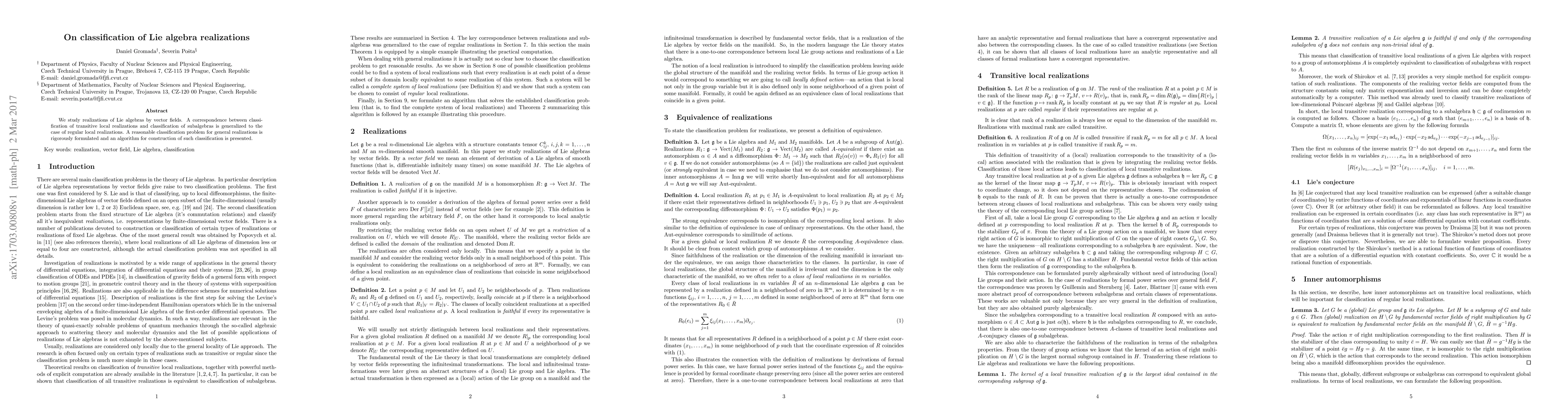 This paper explores the classification of Lie algebra realizations through vector fields, extending the correspondence between transitive and regular local realizations to subalgebras. It formulates a rigorous classification problem and presents an algorithm for constructing such classifications.