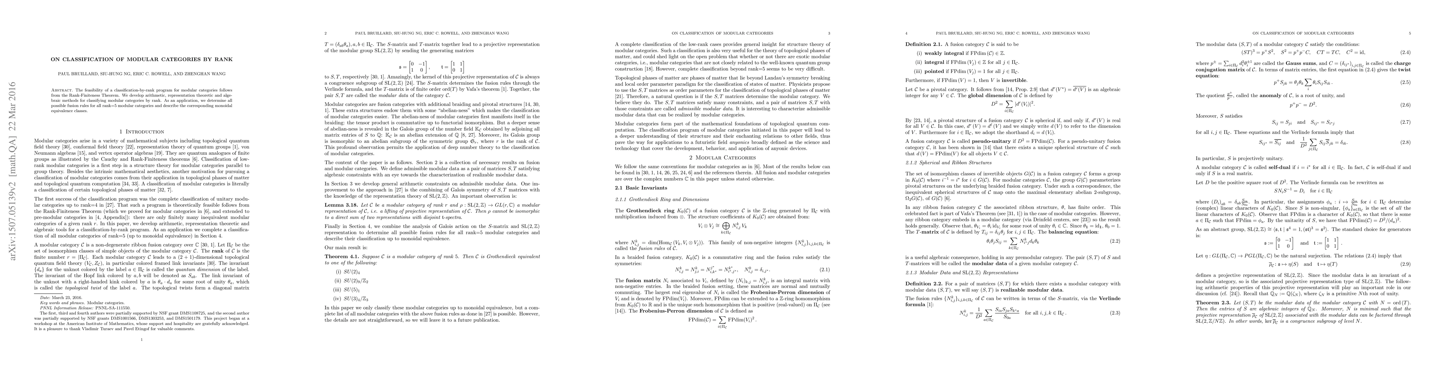This paper develops methods to classify modular categories based on their rank, leveraging the Rank-Finiteness Theorem, and determines all fusion rules and equivalence classes for rank=5 modular categories.