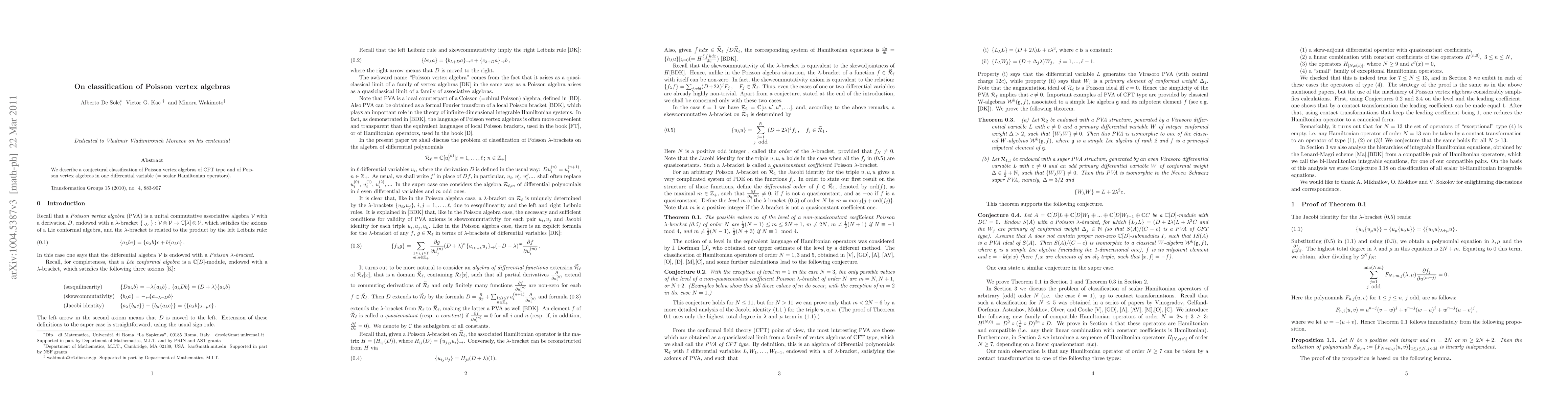 We describe a conjectural classification of Poisson vertex algebras of CFT type and of Poisson vertex algebras in one differential variable (= scalar Hamiltonian operators).