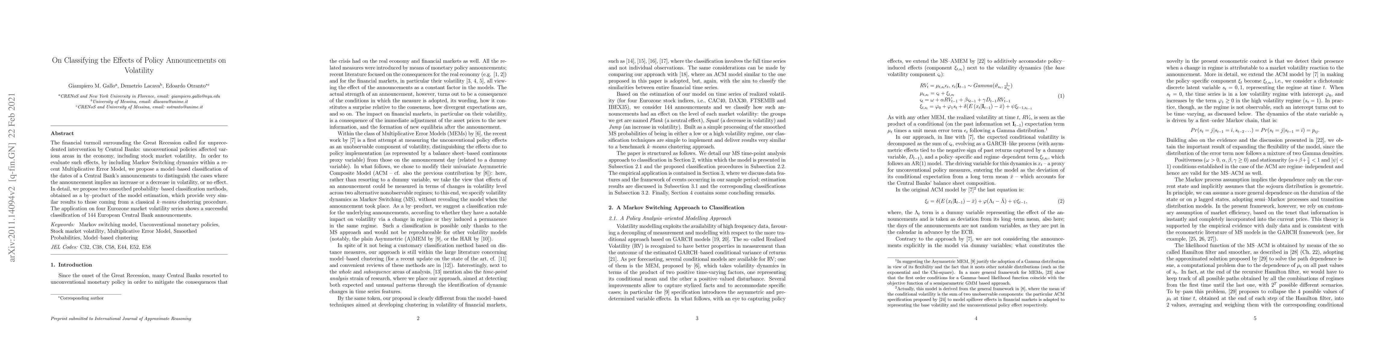 This paper proposes a model-based classification to distinguish the effects of Central Bank policy announcements on stock market volatility, using a Multiplicative Error Model with Markov Switching dynamics. The study successfully classifies 144 ECB announcements into volatility increase, decrease, or no effect categories, demonstrating the effectiveness of the proposed methods.