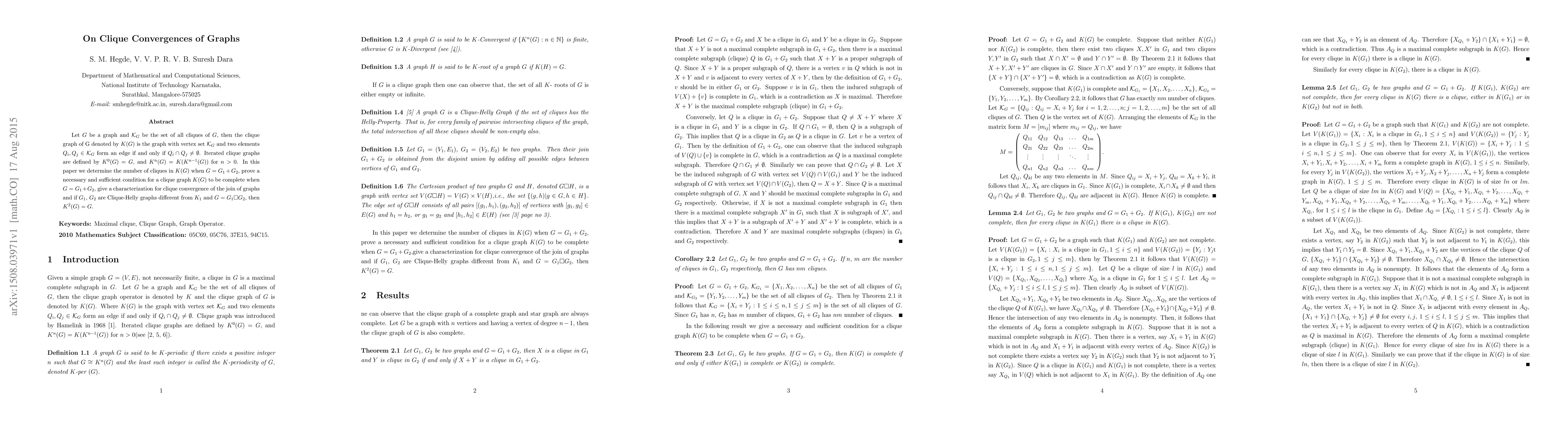 Let $G$ be a graph and $\mathcal{K}_G$ be the set of all cliques of $G$, then the clique graph of G denoted by $K(G)$ is the graph with vertex set $\mathcal{K}_G$ and two elements $Q_i,Q_j \in \mathcal{K}_G$ form an edge if and only if $Q_i \cap Q_j \neq \emptyset$. Iterated clique graphs are defined by $K^0(G)=G$, and $K^n(G)=K(K^{n-1}(G))$ for $n>0$. In this paper we determine the number of cliques in $K(G)$ when $G=G_1+G_2$, prove a necessary and sufficient condition for a clique graph $K(G)$ to be complete when $G=G_1+G_2$, give a characterization for clique convergence of the join of graphs and if $G_1$, $G_2$ are Clique-Helly graphs different from $K_1$ and $G=G_1 \Box G_2$, then $K^2(G) = G$.