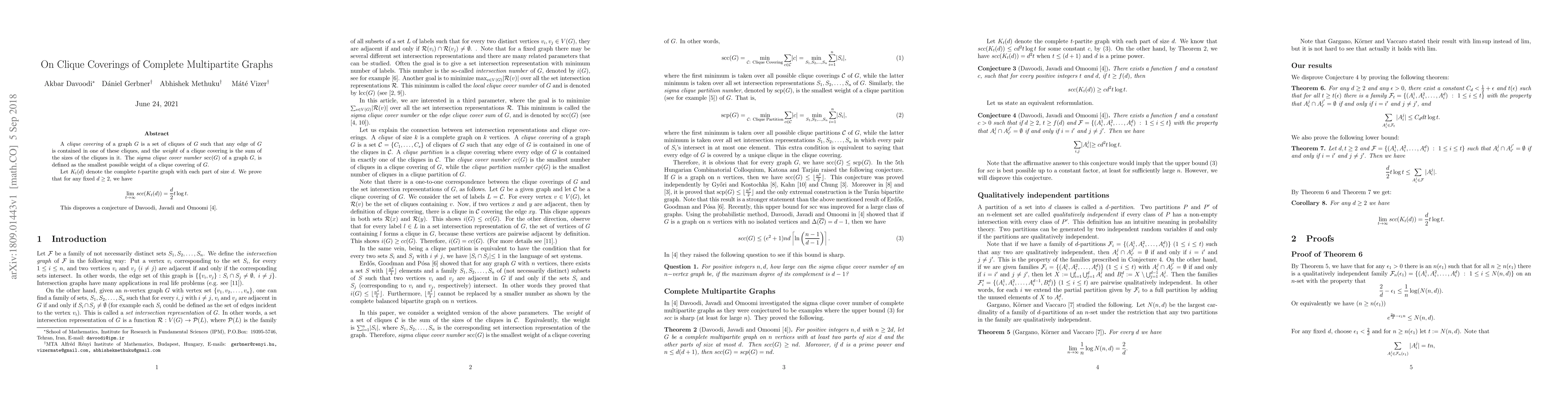 A clique covering of a graph $G$ is a set of cliques of $G$ such that any edge of $G$ is contained in one of these cliques, and the weight of a clique covering is the sum of the sizes of the cliques in it. The sigma clique cover number $scc(G)$ of a graph $G$, is defined as the smallest possible weight of a clique covering of $G$. Let $ K_t(d) $ denote the complete $ t $-partite graph with each part of size $d$. We prove that for any fixed $d \ge 2$, we have $$\lim_{t \rightarrow \infty} scc(K_t(d))= \frac{d}{2} t\log t.$$ This disproves a conjecture of Davoodi, Javadi and Omoomi.