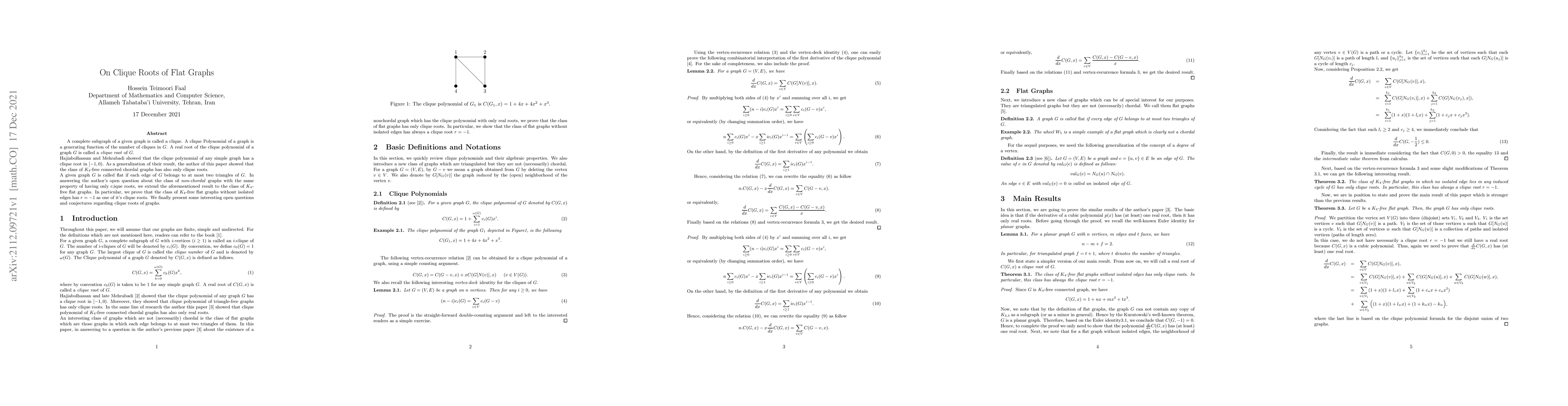 A complete subgraph of a given graph is called a clique. A clique Polynomial of a graph is a generating function of the number of cliques in $G$. A real root of the clique polynomial of a graph $G$ is called a \emph{clique root} of $G$. \\ Hajiabolhassan and Mehrabadi showed that the clique polynomial of any simple graph has a clique root in $[-1,0)$. As a generalization of their result, the author of this paper showed that the class of $K_{4}$-free connected chordal graphs has also only clique roots. \\ A given graph $G$ is called flat if each edge of $G$ belongs to at most two triangles of $G$. In answering the author's open question about the class of \emph{non-chordal} graphs with the same property of having only c;ique roots, we extend the aforementioned result to the class of $K_{4}$-free flat graphs. In particular, we prove that the class of $K_{4}$-free flat graphs without isolated edges has $r=-1$ as one of its clique roots. We finally present some interesting open questions and conjectures regarding clique roots of graphs.