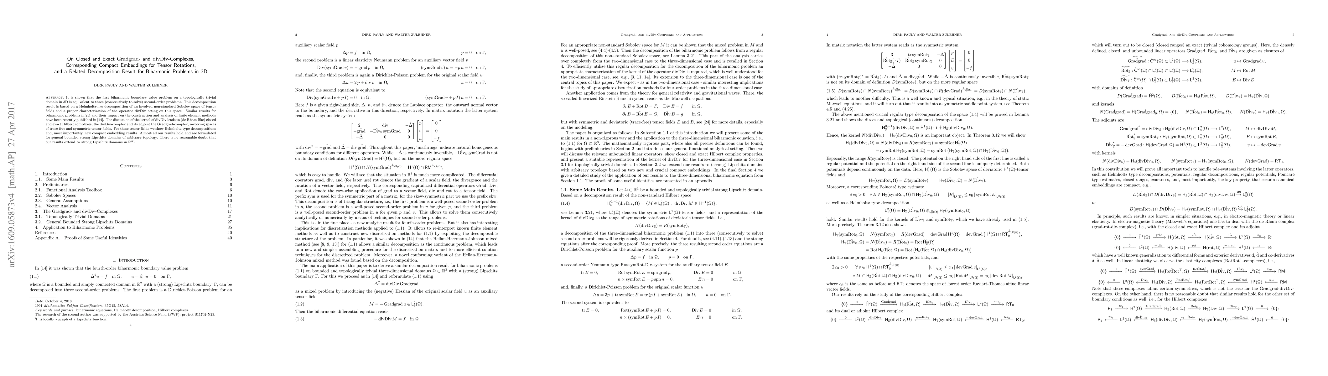 It is shown that the first biharmonic boundary value problem on a topologically trivial domain in 3D is equivalent to three (consecutively to solve) second-order problems. This decomposition result is based on a Helmholtz-like decomposition of an involved non-standard Sobolev space of tensor fields and a proper characterization of the operator div-Div acting on this space. Similar results for biharmonic problems in 2D and their impact on the construction and analysis of finite element methods have been recently published by the second author. The discussion of the kernel of div-Div leads to (de Rham-like) closed and exact Hilbert complexes, the div-Div-complex and its adjoint the Grad-grad-complex, involving spaces of trace-free and symmetric tensor fields. For these tensor fields we show Helmholtz type decompositions and, most importantly, new compact embedding results. Almost all our results hold and are formulated for general bounded strong Lipschitz domains of arbitrary topology. There is no reasonable doubt that our results extend to strong Lipschitz domains in arbitrary dimensions.