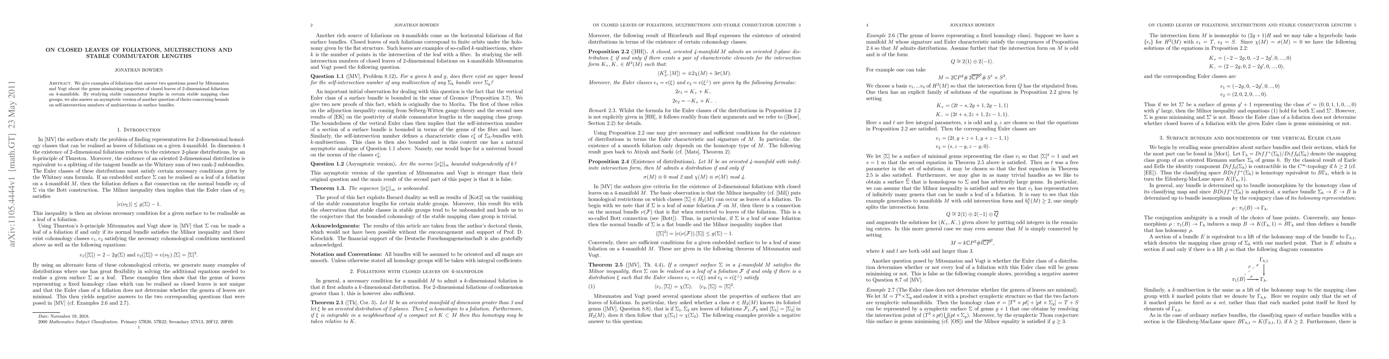 This paper provides examples of foliations that address genus-minimizing properties of closed leaves in 2-dimensional foliations on 4-manifolds, and explores stable commutator lengths in stable mapping class groups to tackle questions about multisection self-intersection bounds.