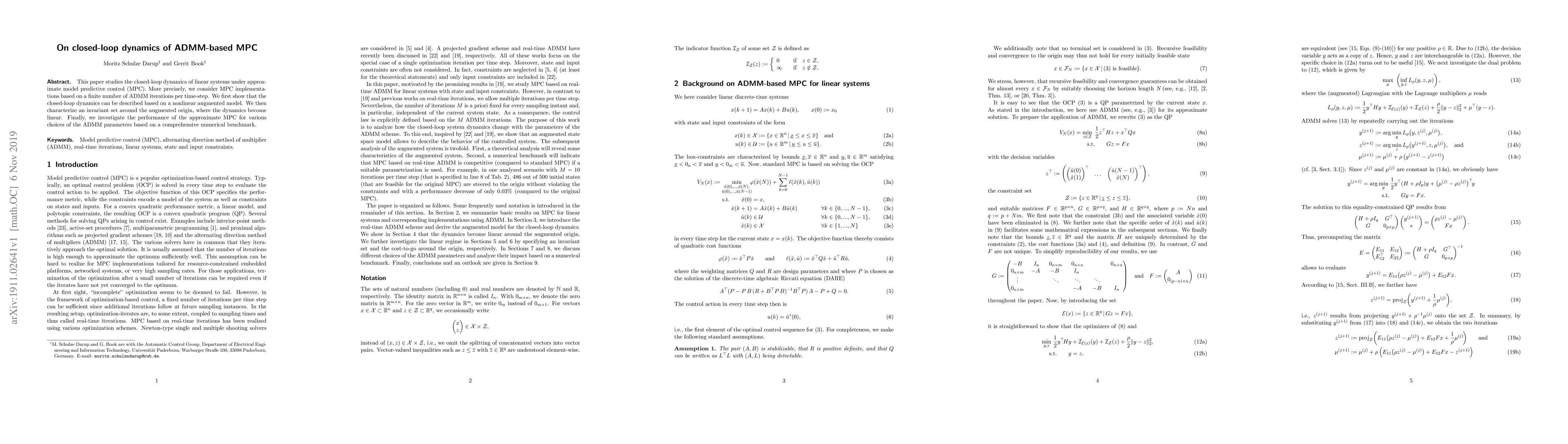 This paper examines the closed-loop dynamics of linear systems under approximate MPC using ADMM, showing that the dynamics can be described by a nonlinear augmented model and identifying an invariant set where the dynamics become linear. It also evaluates the performance of the approximate MPC for different ADMM parameters through numerical benchmarks.