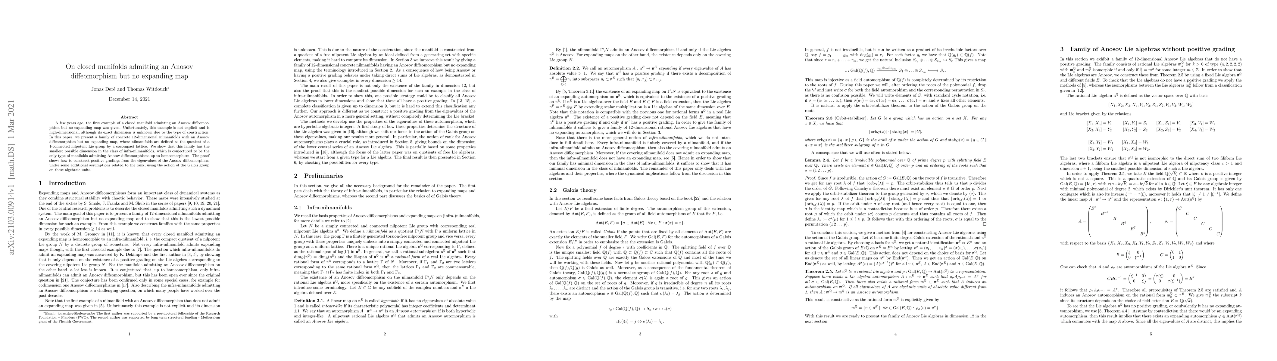 A few years ago, the first example of a closed manifold admitting an Anosov diffeomorphism but no expanding map was given. Unfortunately, this example is not explicit and is high-dimensional, although its exact dimension is unknown due to the type of construction. In this paper, we present a family of concrete 12-dimensional nilmanifolds with an Anosov diffeomorphism but no expanding map, where nilmanifolds are defined as the quotient of a 1-connected nilpotent Lie group by a cocompact lattice. We show that this family has the smallest possible dimension in the class of infra-nilmanifolds, which is conjectured to be the only type of manifolds admitting Anosov diffeomorphisms up to homeomorphism. The proof shows how to construct positive gradings from the eigenvalues of the Anosov diffeomorphism under some additional assumptions related to the rank, using the action of the Galois group on these algebraic units.