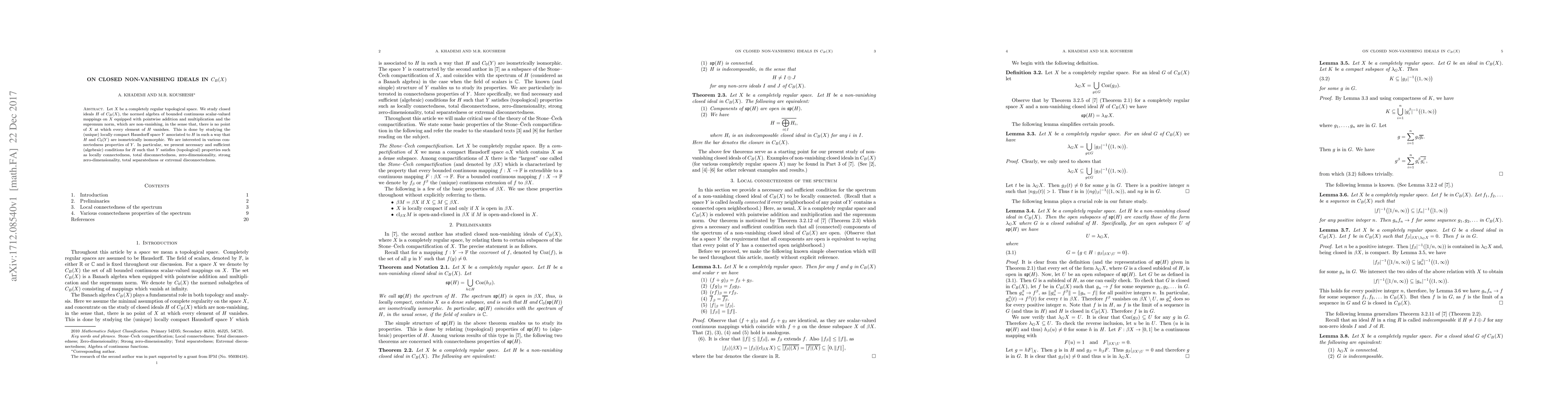 Let $X$ be a completely regular topological space. We study closed ideals $H$ of $C_B(X)$, the normed algebra of bounded continuous scalar-valued mappings on $X$ equipped with pointwise addition and multiplication and the supremum norm, which are non-vanishing, in the sense that, there is no point of $X$ at which every element of $H$ vanishes. This is done by studying the (unique) locally compact Hausdorff space $Y$ associated to $H$ in such a way that $H$ and $C_0(Y)$ are isometrically isomorphic. We are interested in various connectedness properties of $Y$. In particular, we present necessary and sufficient (algebraic) conditions for $H$ such that $Y$ satisfies (topological) properties such as locally connectedness, total disconnectedness, zero-dimensionality, strong zero-dimensionality, total separatedness or extremal disconnectedness.