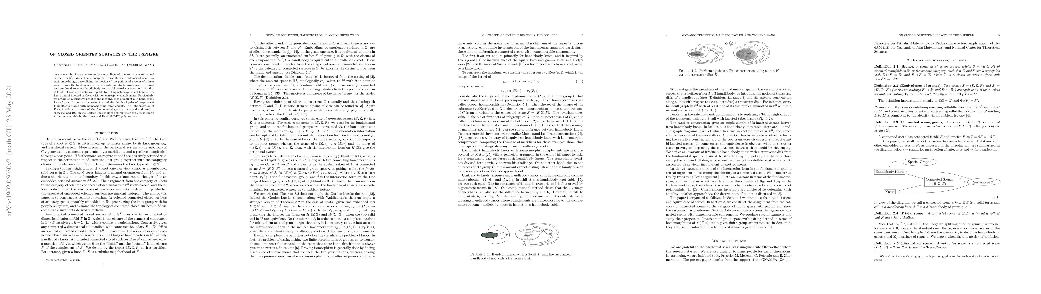 This paper introduces the fundamental span, a complete invariant for embeddings of oriented closed surfaces in the 3-sphere, generalizing knot group peripheral systems. Utilizing this invariant, the authors distinguish inequivalent handlebody knots, create an infinite family of bi-knotted surfaces with homeomorphic complements, and reveal the chirality of Rolfsen knots $9_{42}$ and $10_{71}$, undetectable by Jones and HOMFLY-PT polynomials.
