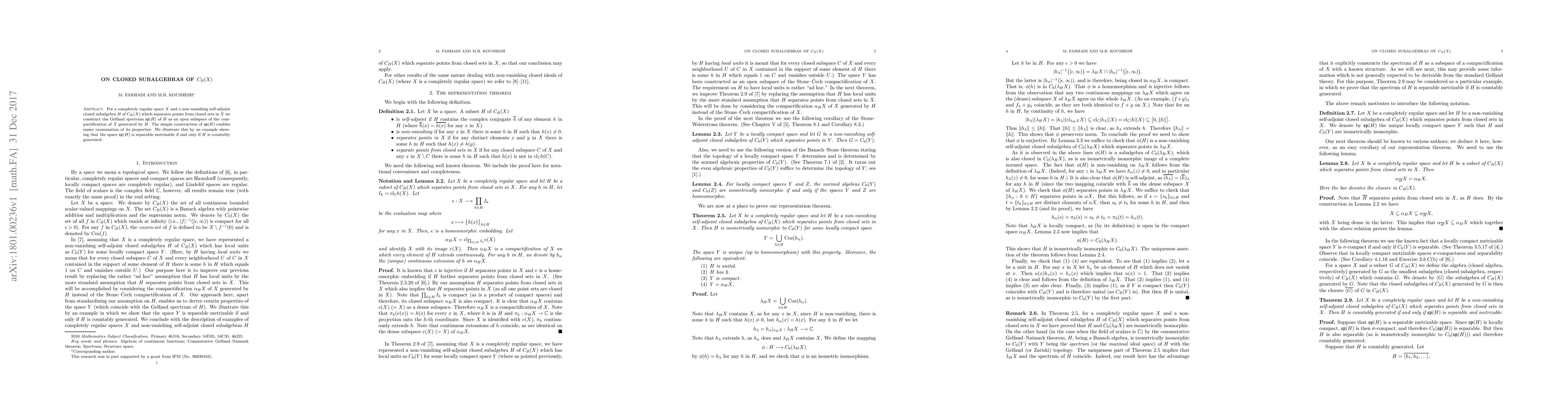 For a completely regular space $X$ and a non-vanishing self-adjoint closed subalgebra $H$ of $C_B(X)$ which separates points from closed sets in $X$ we construct the Gelfand spectrum $\mathfrak{sp}(H)$ of $H$ as an open subspace of the compactification of $X$ generated by $H$. The simple construction of $\mathfrak{sp}(H)$ enables easier examination of its properties. We illustrate this by an example showing that the space $\mathfrak{sp}(H)$ is separable metrizable if and only if $H$ is countably generated.