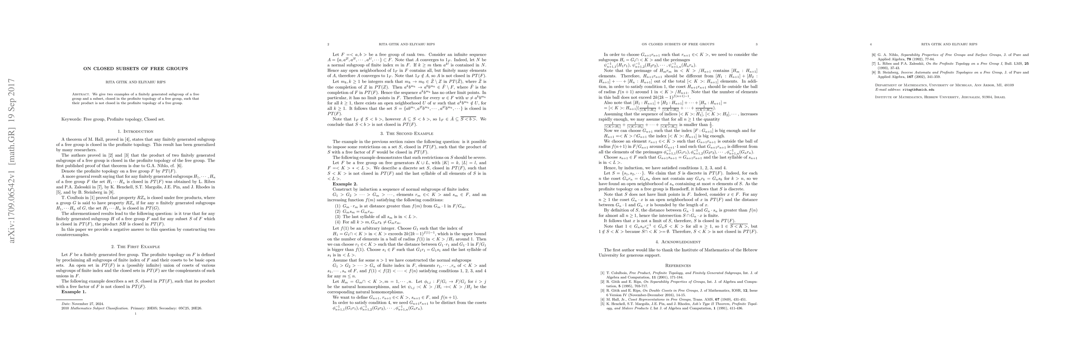 We give two examples of a finitely generated subgroup of a free group and a subset, closed in the profinite topology of a free group, such that their product is not closed in the profinite topology of a free group.
