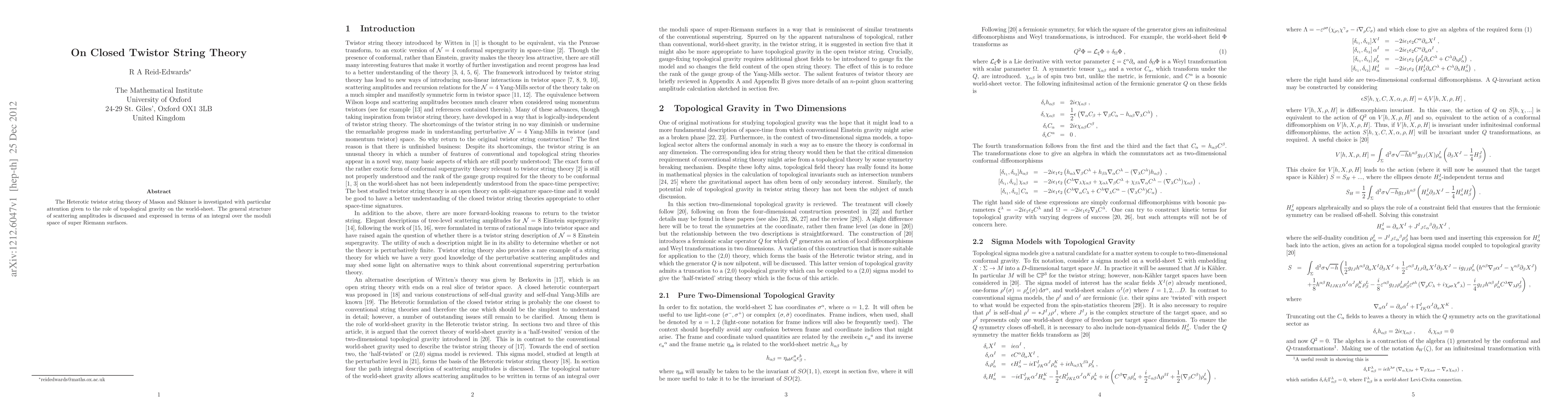 Title: On Closed Twistor String Theory Summary: This paper explores the Heterotic twistor string theory, focusing on topological gravity's impact on the world-sheet, and presents scattering amplitudes through an integral over the moduli space of super Riemann surfaces.