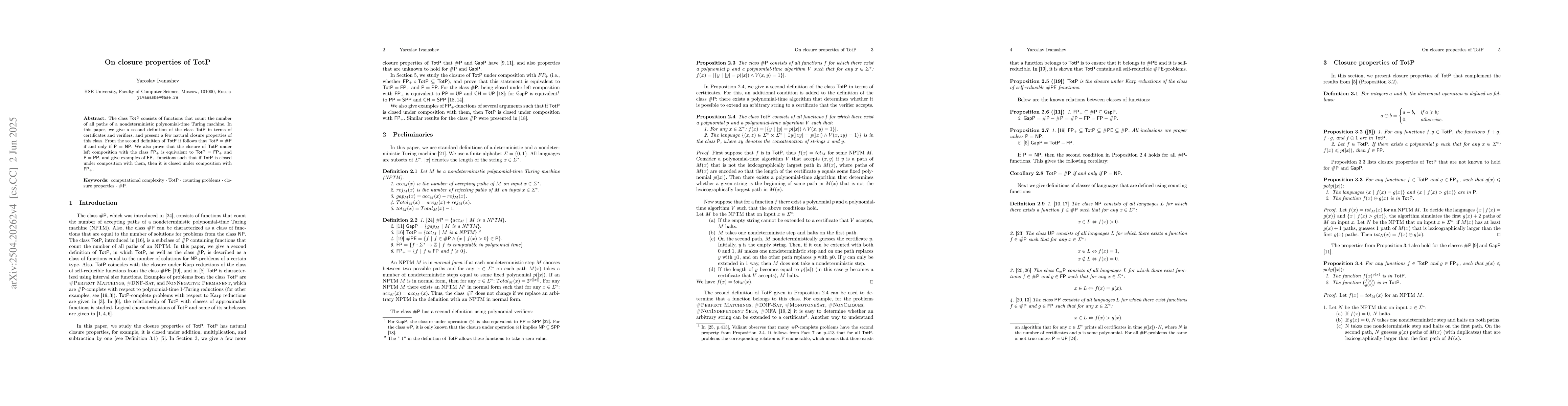 The paper provides a redefinition of the class TotP using certificates and verifiers, then explores its closure properties and compositions.