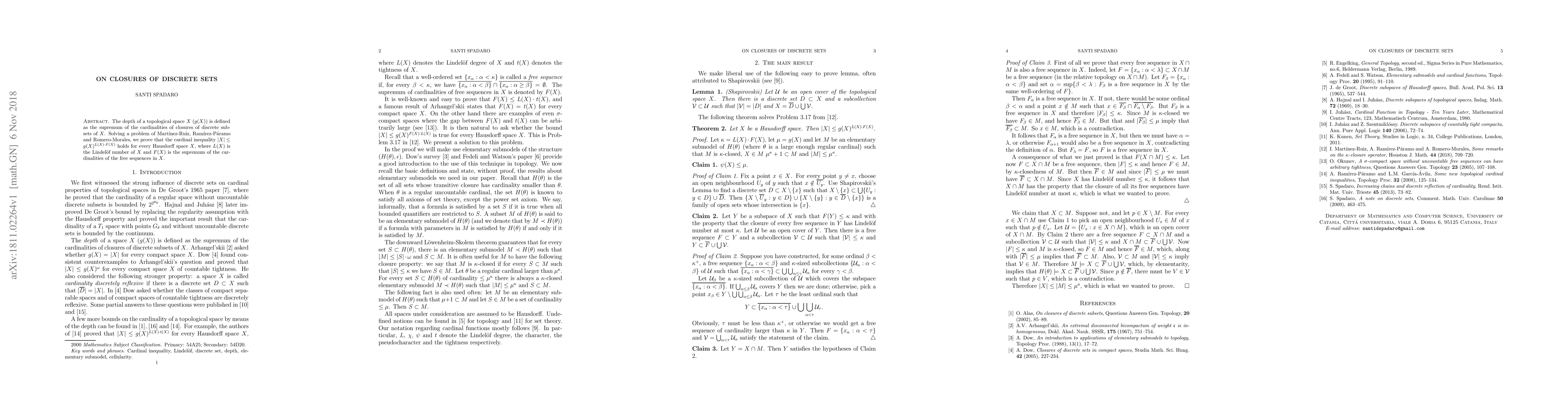The depth of a topological space $X$ ($g(X)$) is defined as the supremum of the cardinalities of closures of discrete subsets of $X$. Solving a problem of Mart\'inez-Ruiz, Ram\'irez-P\'aramo and Romero-Morales, we prove that the cardinal inequality $|X| \leq g(X)^{L(X) \cdot F(X)}$ holds for every Hausdorff space $X$, where $L(X)$ is the Lindel\"of number of $X$ and $F(X)$ is the supremum of the cardinalities of the free sequences in $X$.