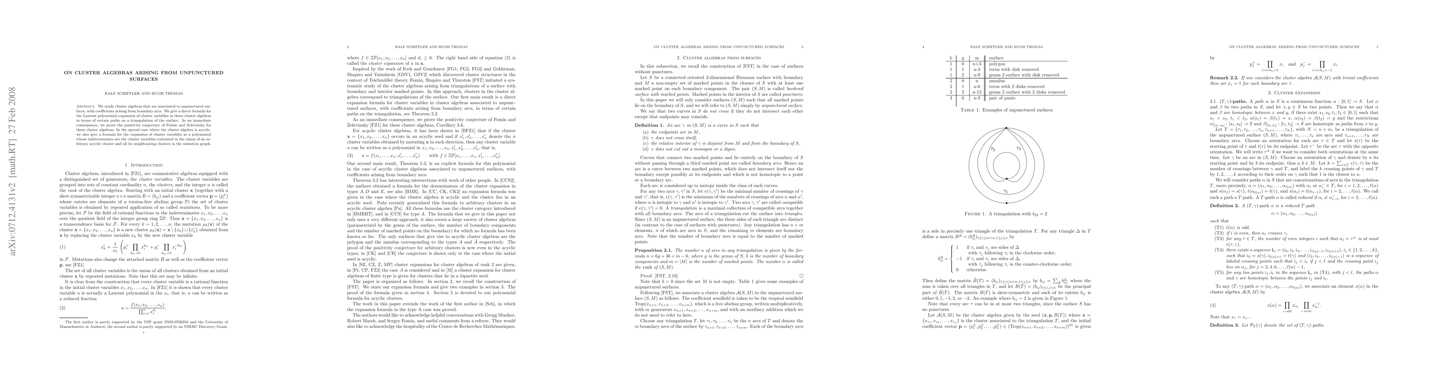 We study cluster algebras that are associated to unpunctured surfaces with coefficients arising from boundary arcs. We give a direct formula for the Laurent polynomial expansion of cluster variables in these cluster algebras in terms of certain paths on a triangulation of the surface. As an immediate consequence, we prove the positivity conjecture of Fomin and Zelevinsky for these cluster algebras. In the special case where the cluster algebra is acyclic, we also give a formula for the expansion of cluster variables as a polynomial whose indeterminates are the cluster variables contained in the union of an arbitrary acyclic cluster and all its neighbouring clusters in the mutation graph.