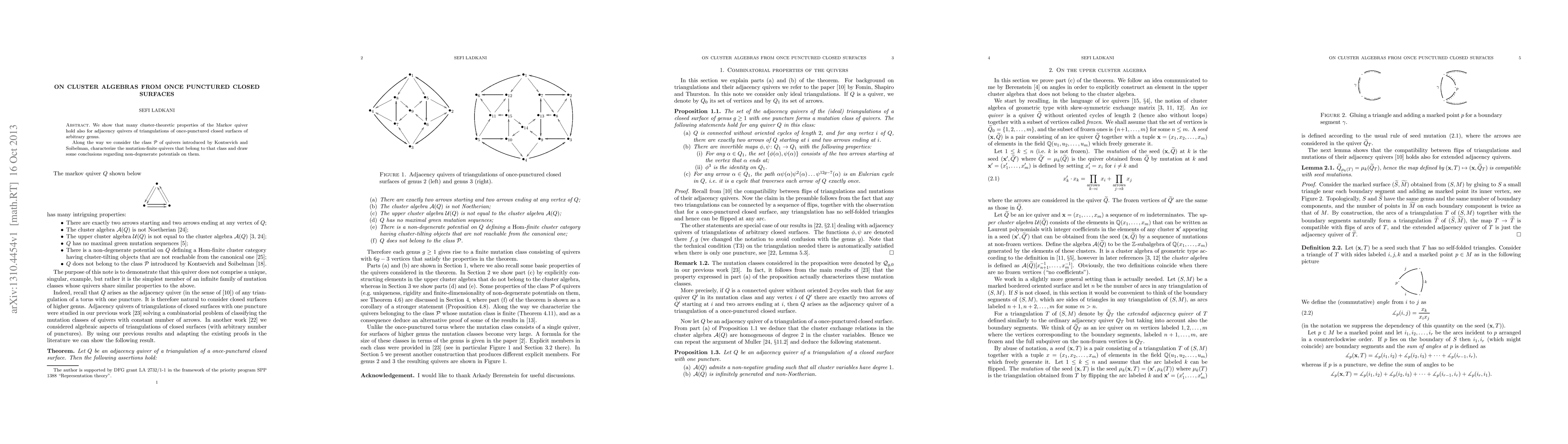 We show that many cluster-theoretic properties of the Markov quiver hold also for adjacency quivers of triangulations of once-punctured closed surfaces of arbitrary genus. Along the way we consider the class P of quivers introduced by Kontsevich and Soibelman, characterize the mutation-finite quivers that belong to that class and draw some conclusions regarding non-degenerate potentials on them.